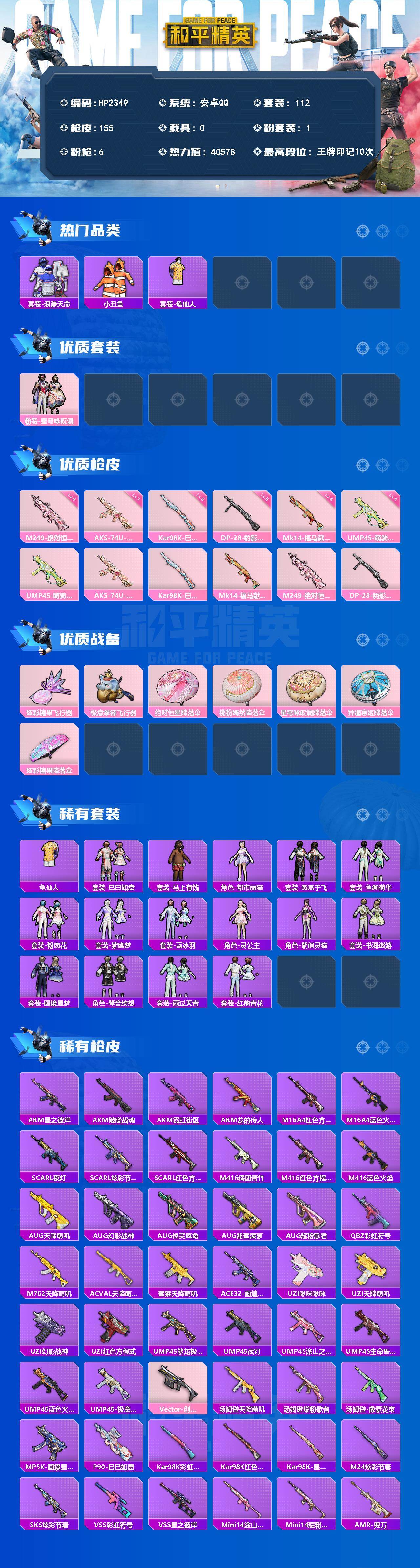 【HP2349】112套装/枪械6/装备162/战备109/王牌印记10/热力值40578/四级UMP45-萌骑冒险/七级AKS-74U-星穹咏叹调/五级Kar98K-巳巳如意/四级Mk14-福马献瑞/六级M249-绝对恒星/五级DP-28-豹影疾电/套装-浪漫天命/套装-小丑鱼/套装-龟仙人/粉装-星穹咏叹调/UMP45-萌骑冒险/AKS-74U-星穹咏叹调/Kar98K-巳巳如意/Mk14-福马献瑞/M249-绝对恒星/DP-28-豹影疾电/炫彩糖果飞行器/极意拳锋飞行器/绝对恒星降落伞/桃