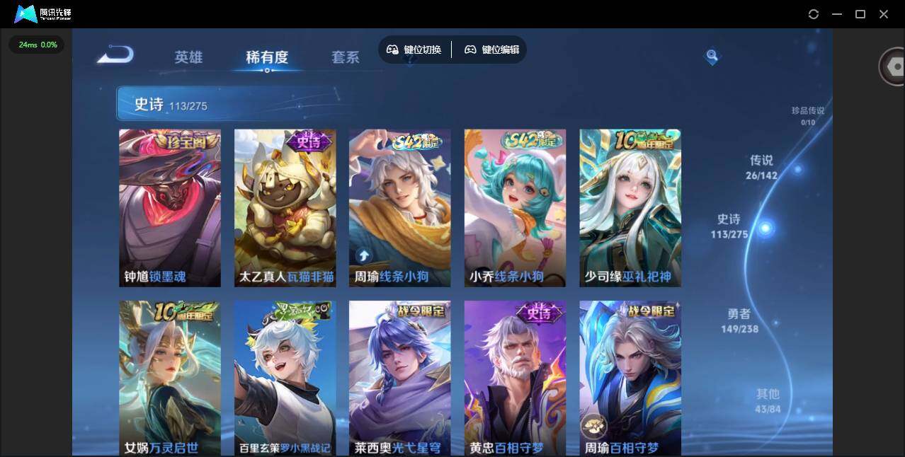 实名: 可修改 贵族等级: V9 英雄数: 128 皮肤数: 332 荣耀水晶