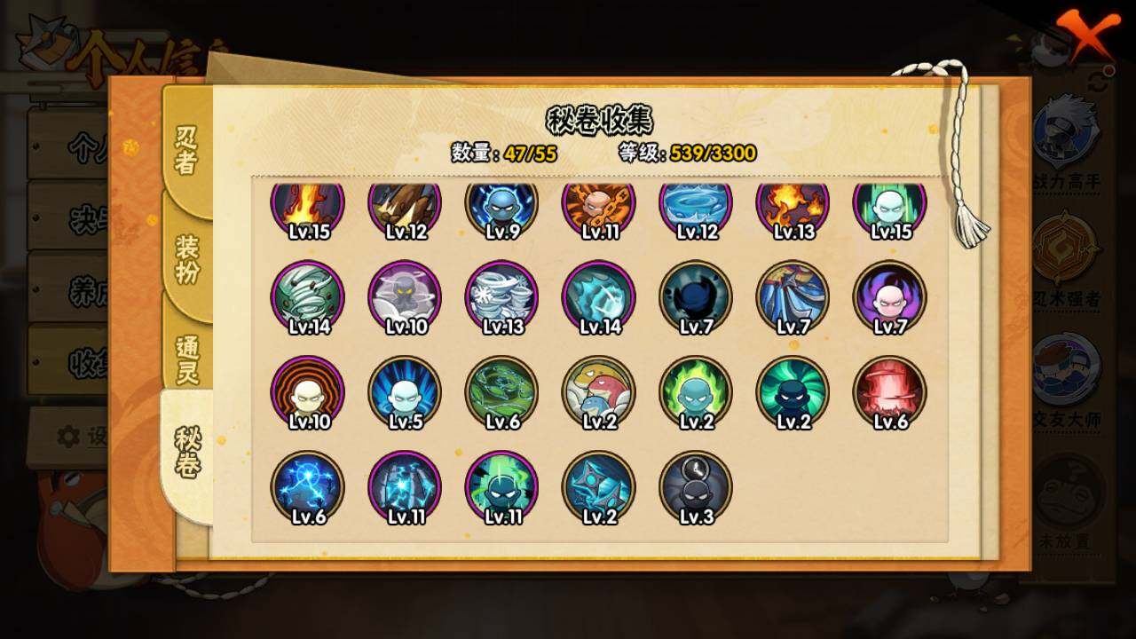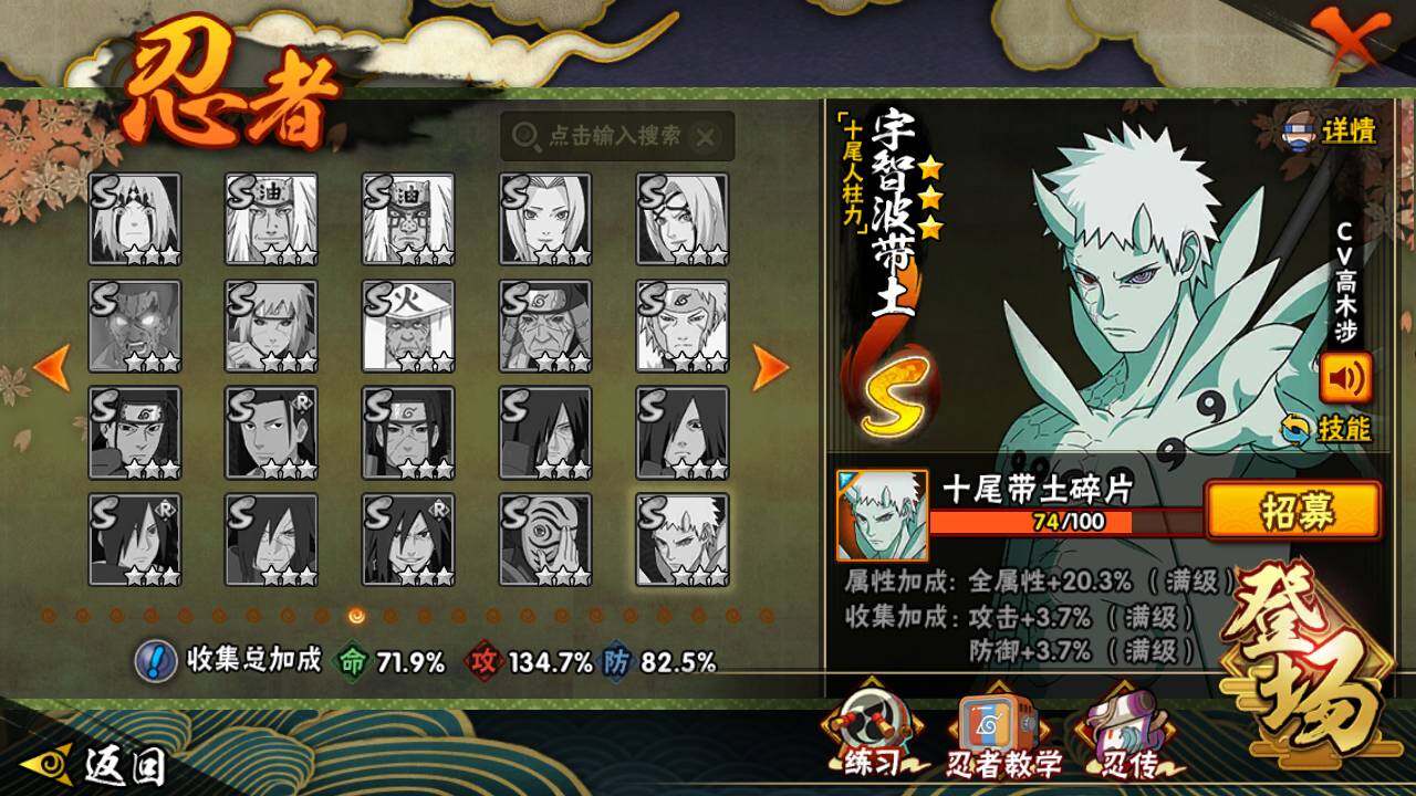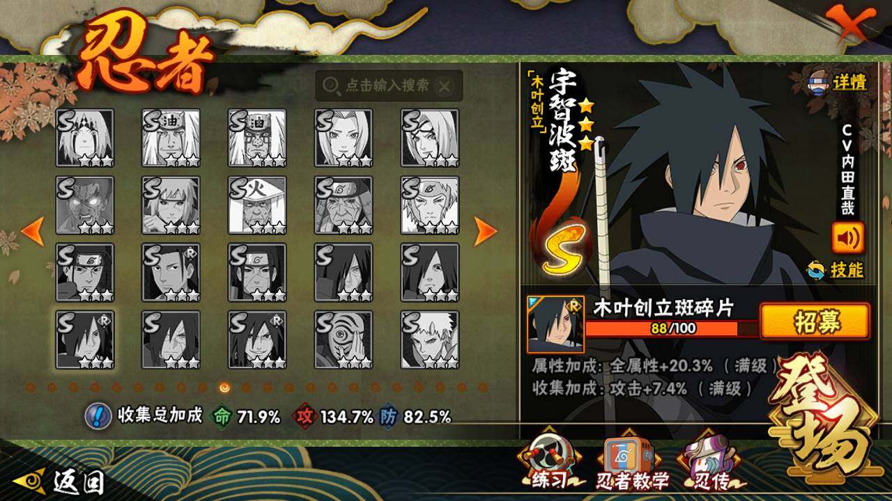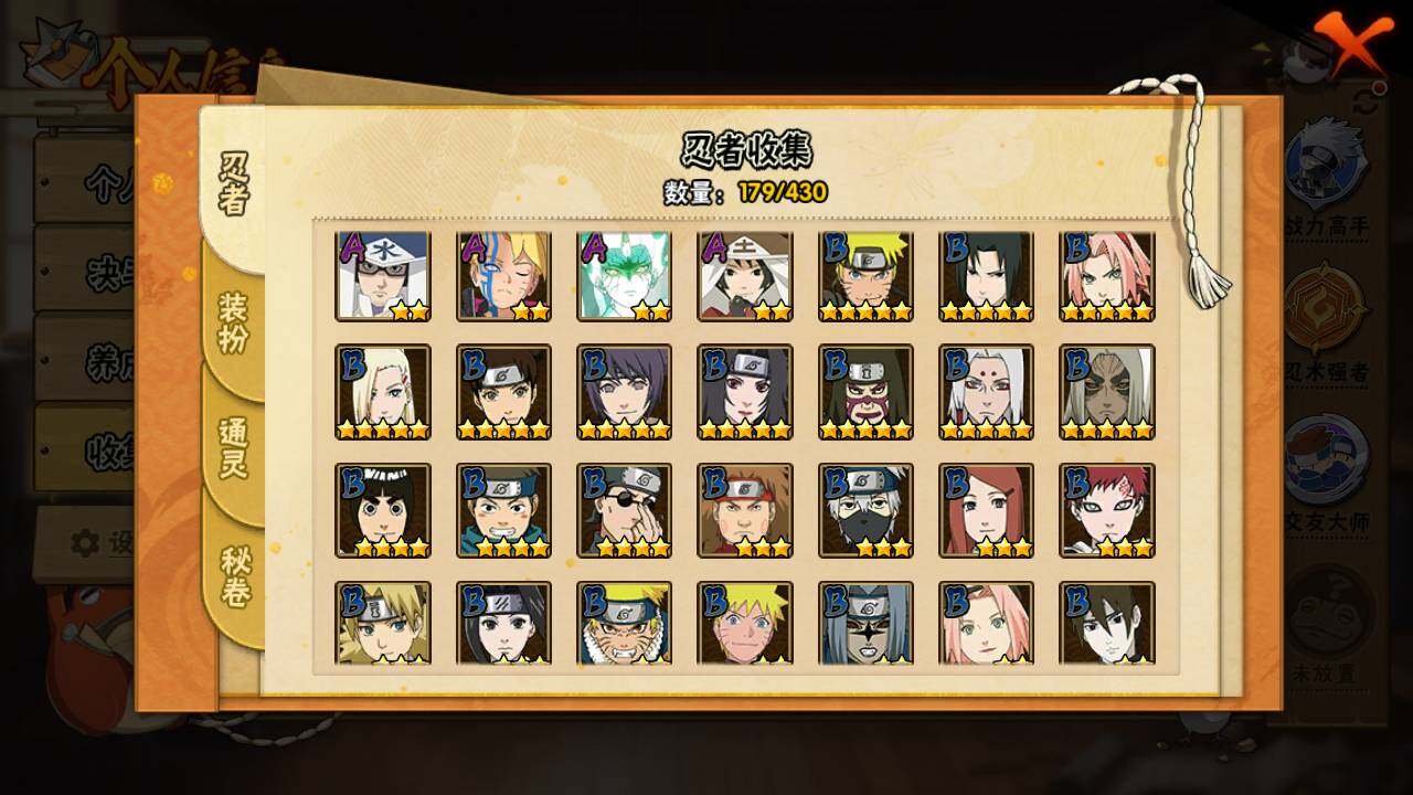 【S级忍者】:长门「秽土转生」(3星),千手扉间「秽土转生」(3星),宇智波鼬「秽土转生」(3星),宇智波带土「忍界大战」(3星),艾「忍界大战」(3星),宇智波鼬「须佐能乎」(3星),宇智波止水「须佐能乎」(3星),旗木卡卡西「须佐能乎」(3星),自来也「舞之豪杰」(
