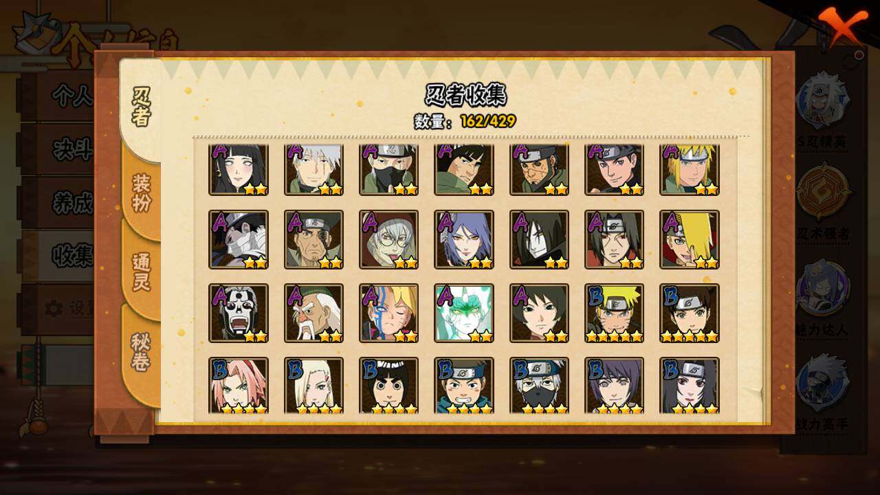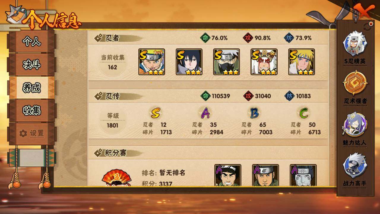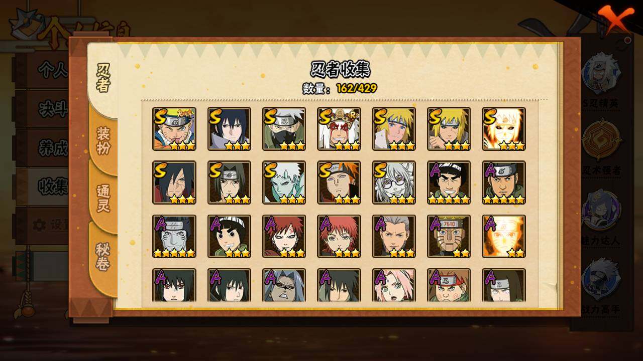 【S级忍者】:波风水门「秽土转生」(3星),宇智波斑「秽土转生·解」(3星),宇智波鼬「须佐能乎」(3星),旗木卡卡西「须佐能乎」(3星),自来也「舞之豪杰」(3星),波风水门(3星),药师兜「仙人模式」(3星),佩恩「天道」(3星),宇智波佐助「永恒万花筒」(3星),波风水门「九喇嘛连结」(3星