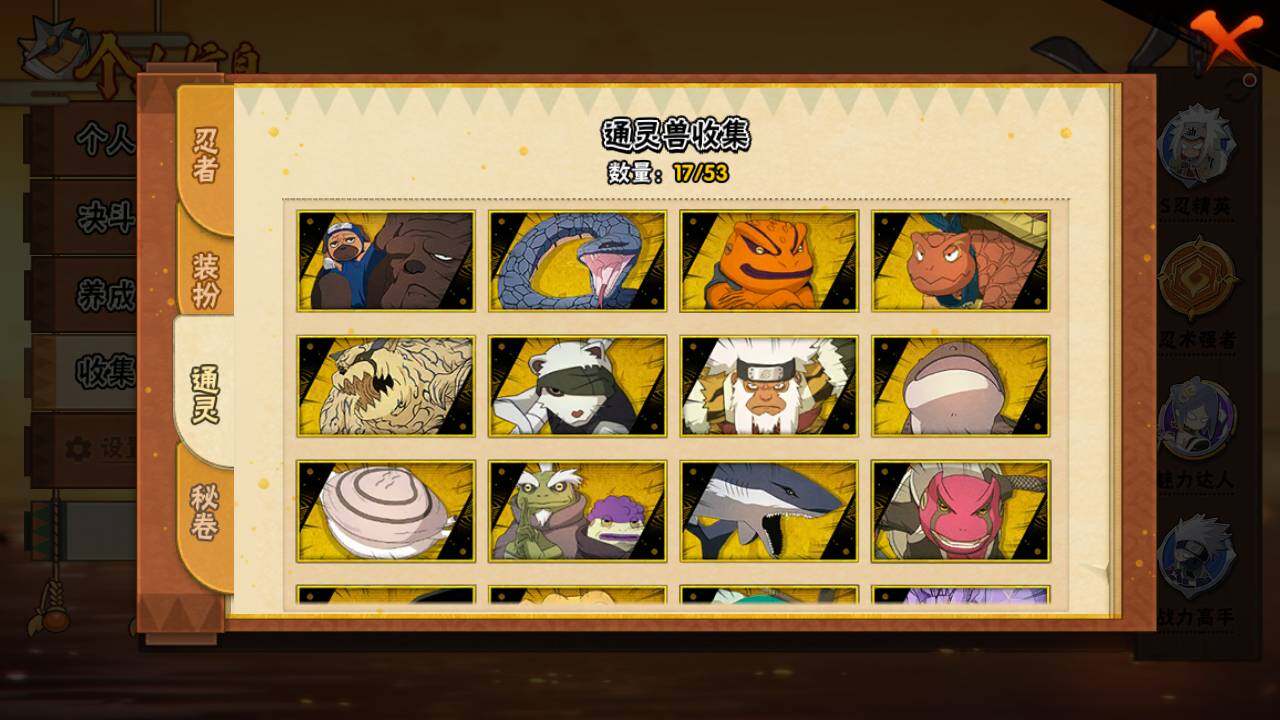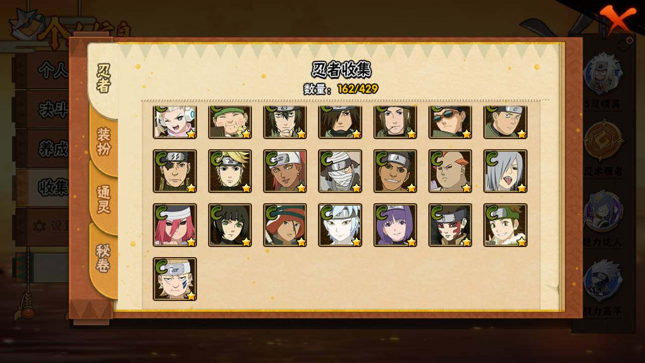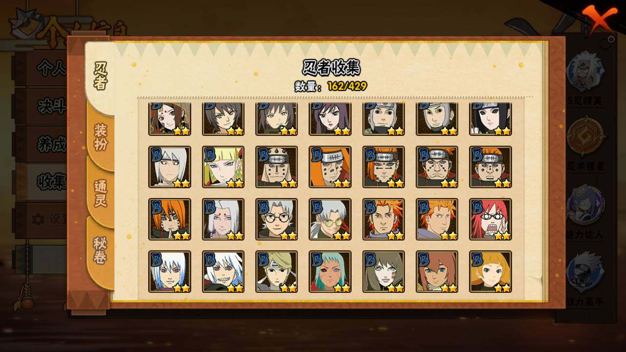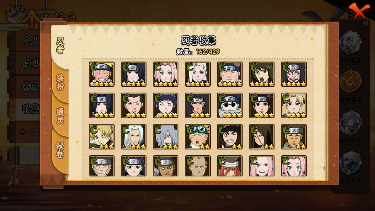 【S级忍者】:波风水门「秽土转生」(3星),宇智波斑「秽土转生·解」(3星),宇智波鼬「须佐能乎」(3星),旗木卡卡西「须佐能乎」(3星),自来也「舞之豪杰」(3星),波风水门(3星),药师兜「仙人模式」(3星),佩恩「天道」(3星),宇智波佐助「永恒万花筒」(3星),波风水门「九喇嘛连结」(3星