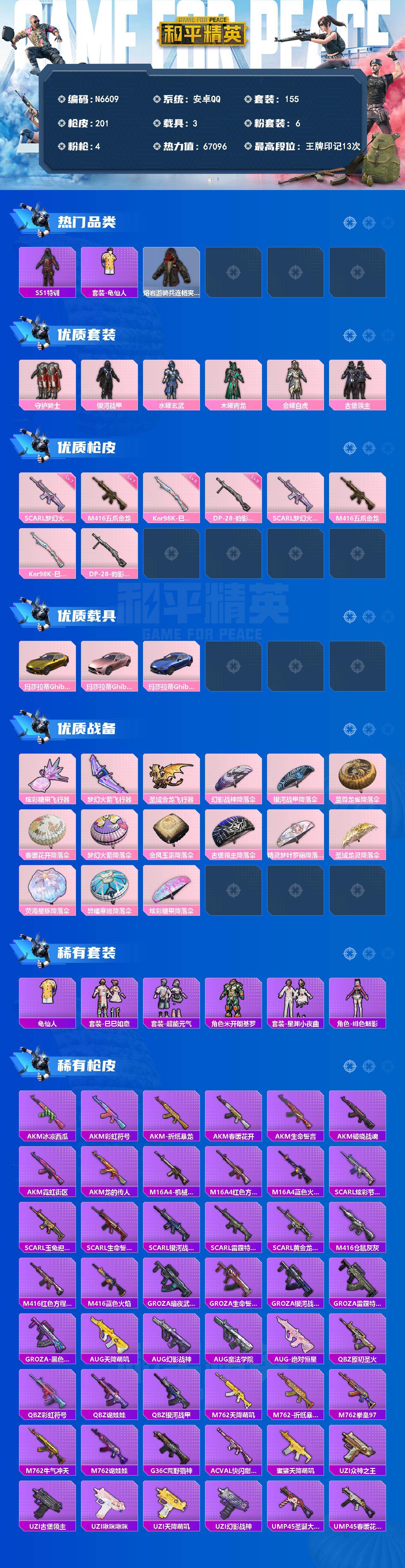安卓 手Q-6粉装-4特效枪-3载具-3粉色飞行器-67096热力值-13王牌印记-155套装-201枪皮