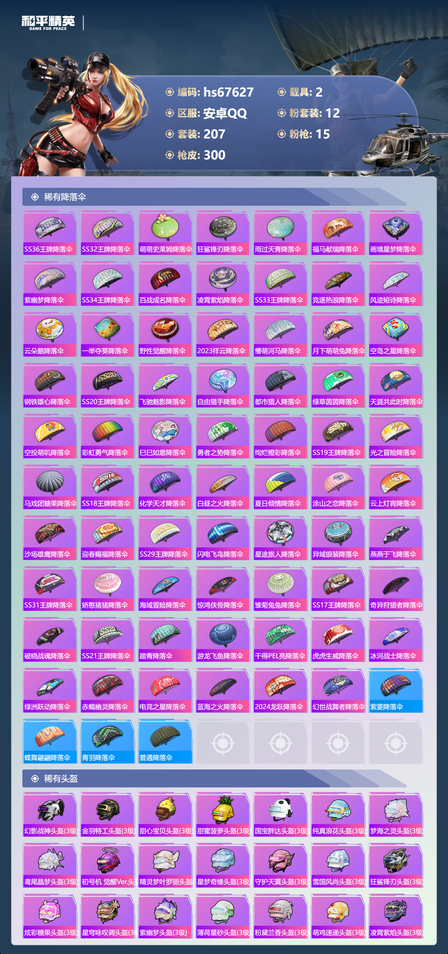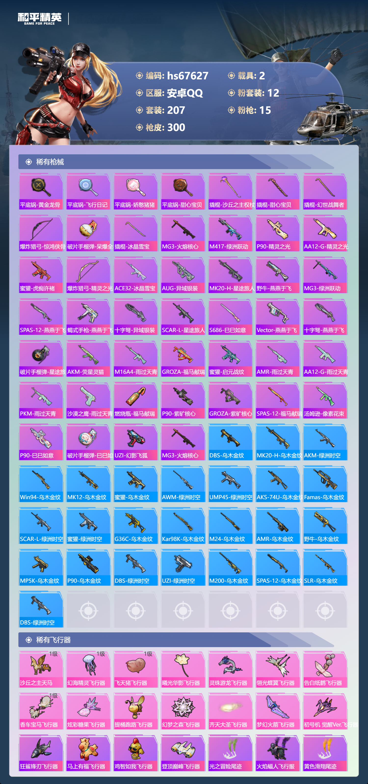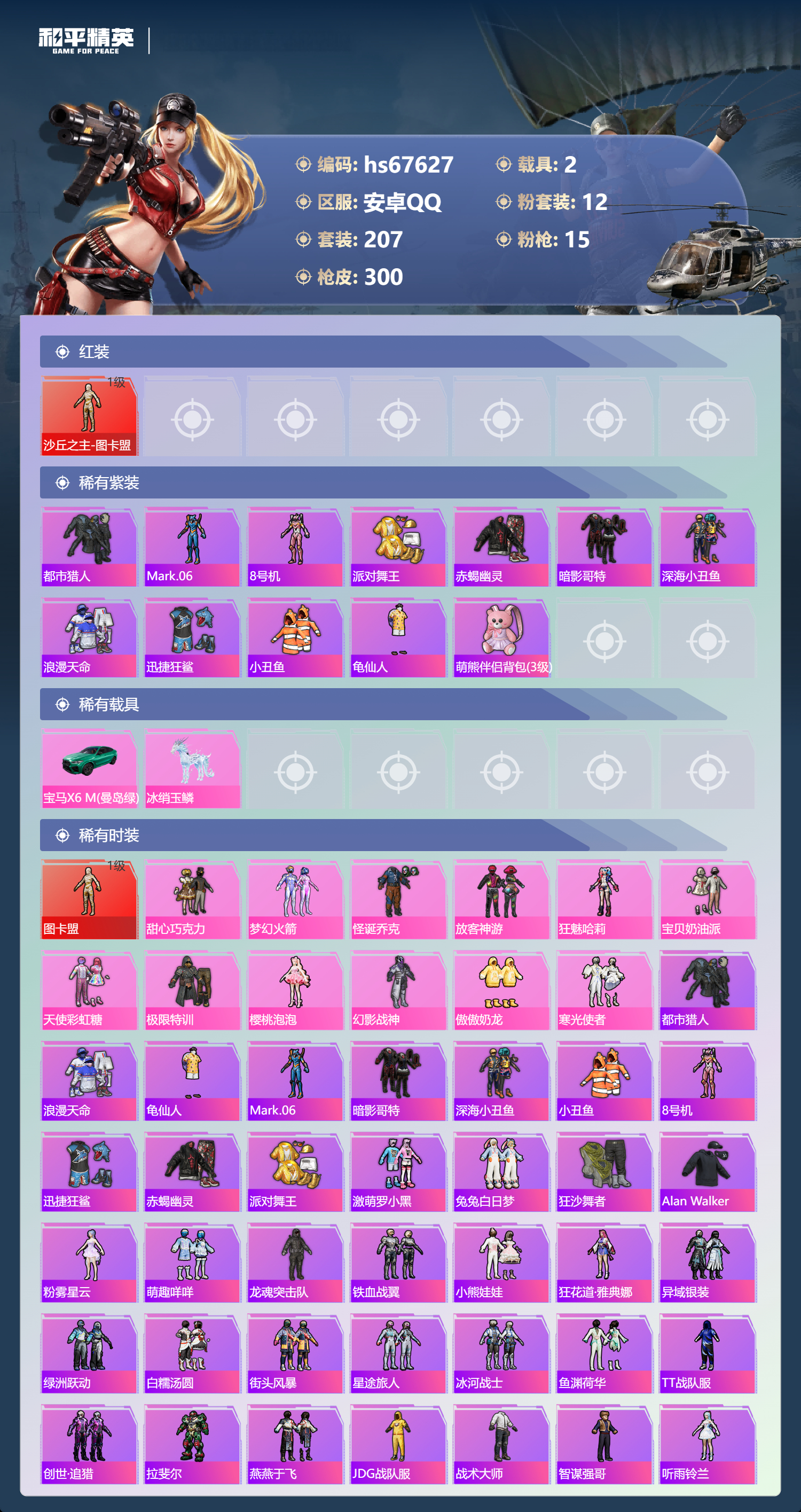 hs67627 安卓手Q-14王牌印记-1红装-12粉装-15特效枪-2载具-99967热力值-207套装-300枪皮-5卓越印记-3传奇印记