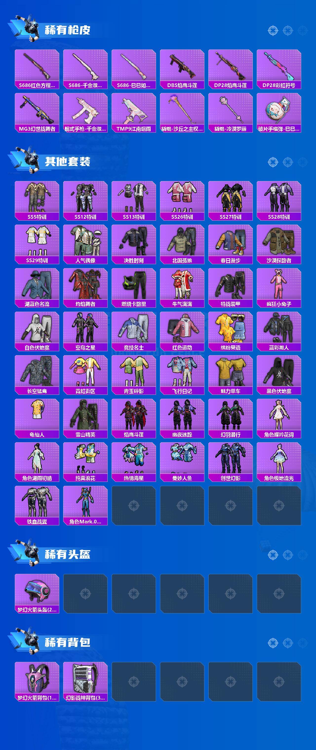 1神装-2粉装-8特效枪-2载具-2粉色飞行器-39130热力值-5王牌印记-74套装-106枪皮