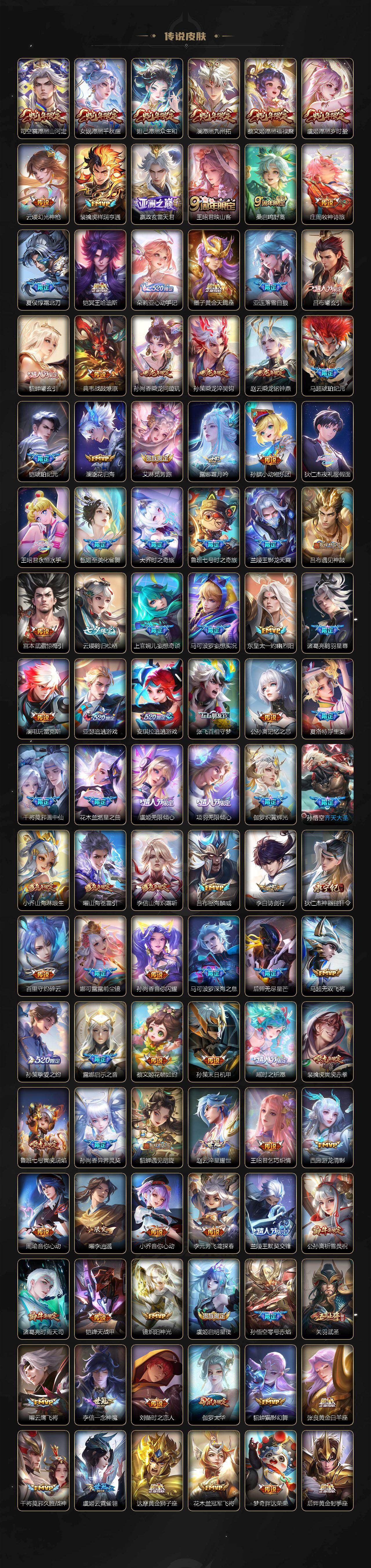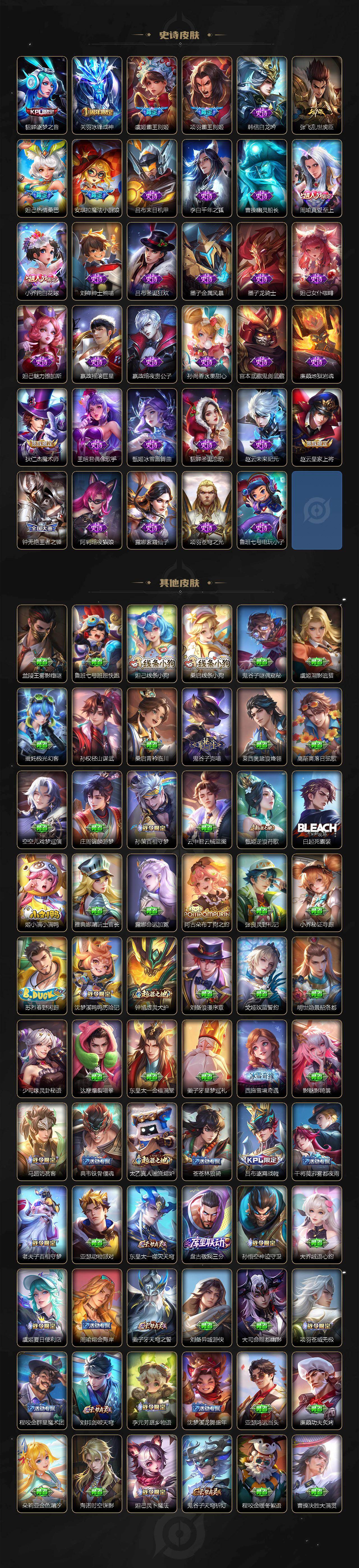 【英雄全皮】:廉颇全皮,庄周全皮,刘禅全皮,高渐离全皮,孙膑全皮,白起全皮,夏侯惇全皮,甄姬全皮,典韦全皮,宫本武藏全皮,马可波罗全皮,司马懿全皮,程咬金全皮,姜子牙全皮,刘邦全皮,孙权全皮,娜可露露全皮,牛魔全皮,刘备全皮,张飞全皮,虞姬全皮,杨玉环全皮,苍全皮,鬼谷子全皮,黄忠全皮,苏烈全皮,百里守约全皮,弈星