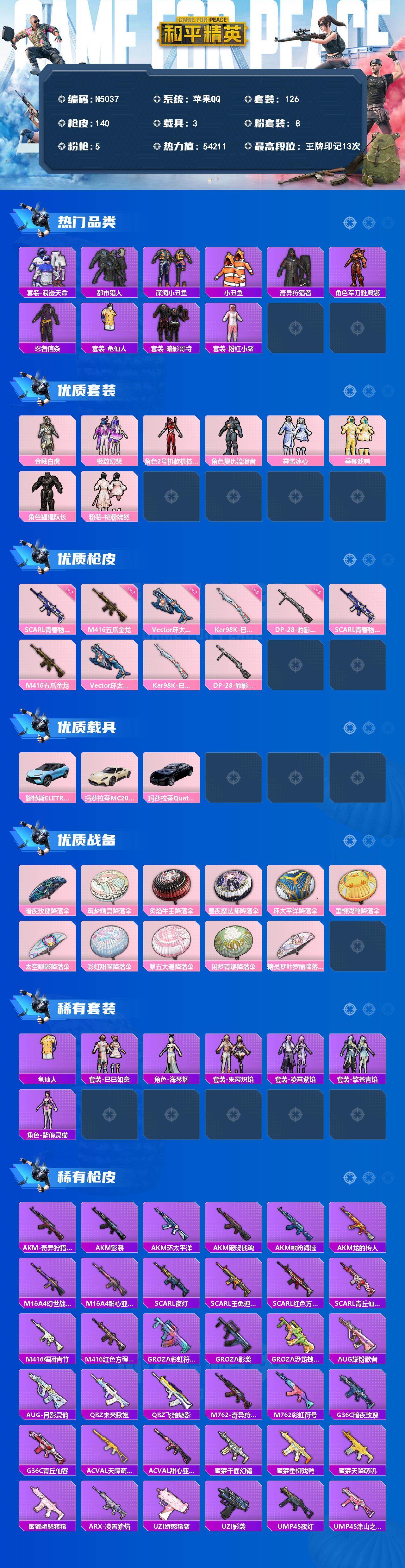 苹果 手Q-8粉装-5特效枪-3载具-0粉色飞行器-54211热力值-13王牌印记-126套装-140枪皮