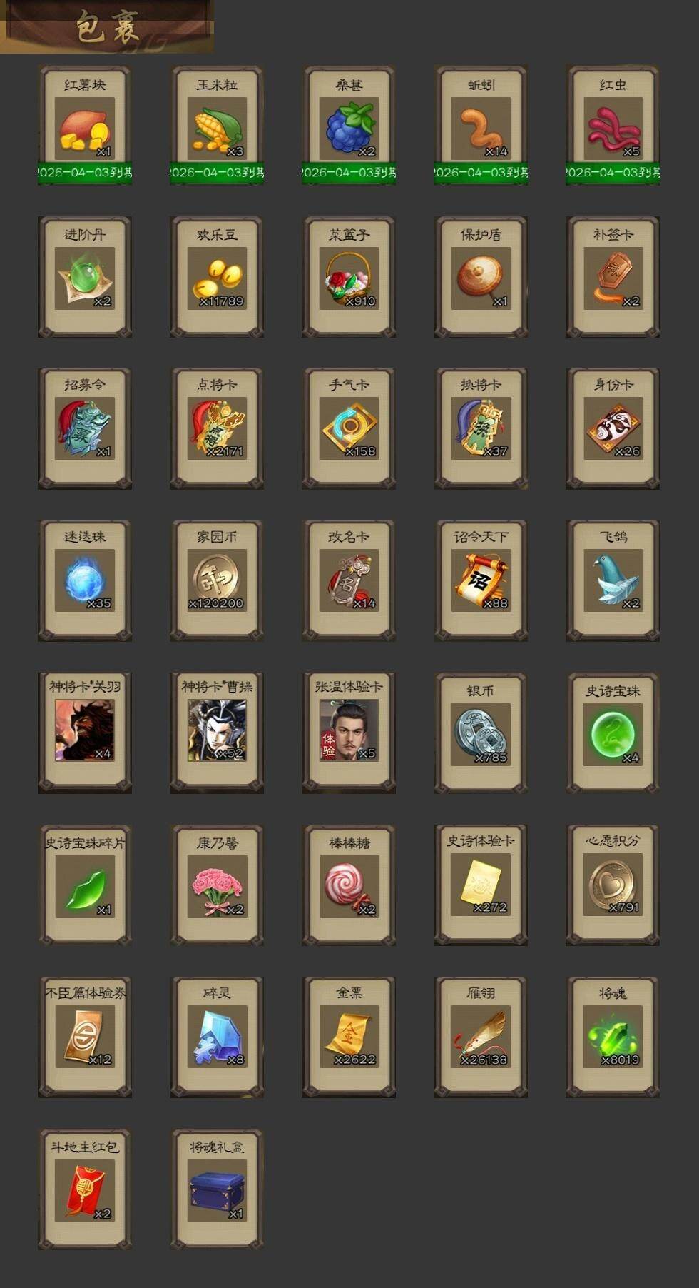官阶:大将军;VIP等级:VIP10;史诗武将数量:40;动态皮肤数量:29;武将总数:386;史诗宝珠数量:4;将魂数量:8019;神将:3;魏国史诗武将:15;蜀国史诗武将:9;吴国史诗武将:7;群史诗武将:14