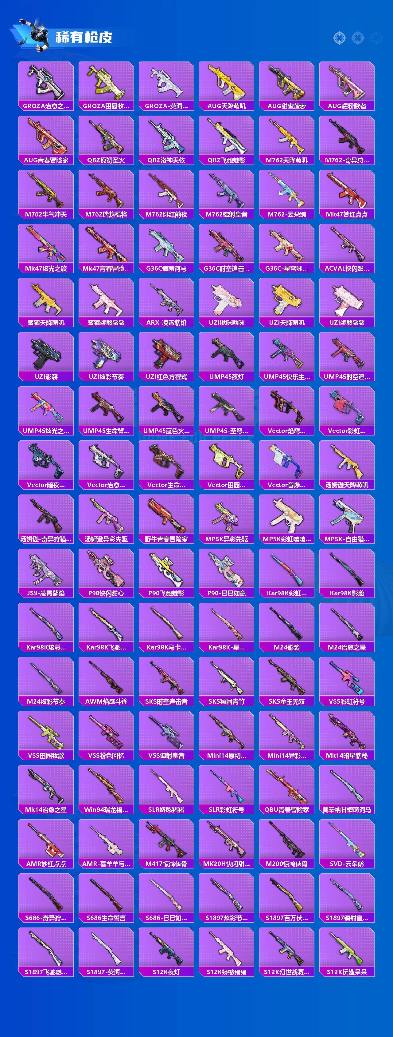 【粉色枪皮等级】:AKM-绿萝繁花(五级),SCAR-L-锦绣绵绵(五级),M416-电玩时刻(五级),GROZA-镜光银凌(五级),蜜獾-荧海星豚(六级),AKS-74U-星穹咏叹调(七级),Kar98K-巳巳如意(五级),AMR-炫