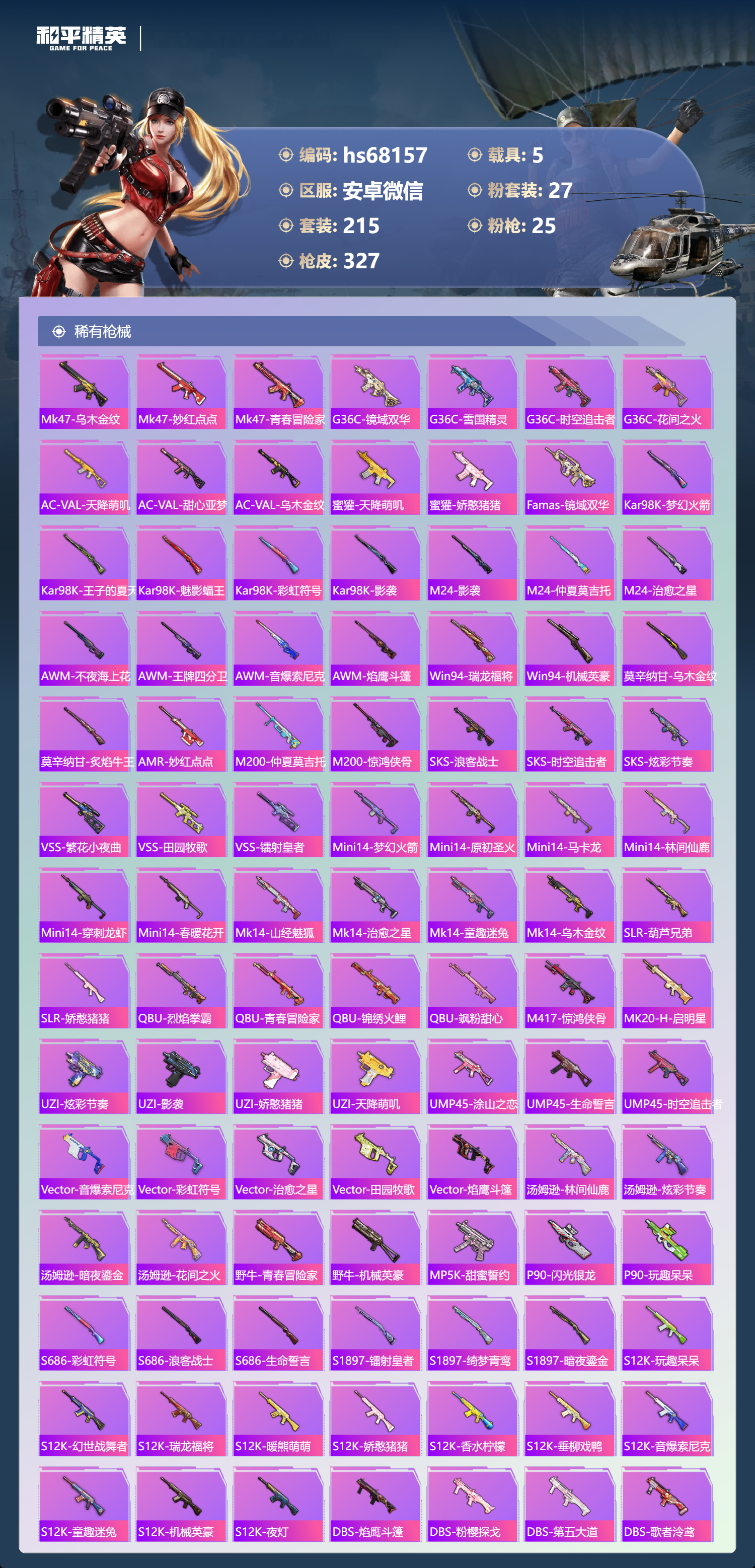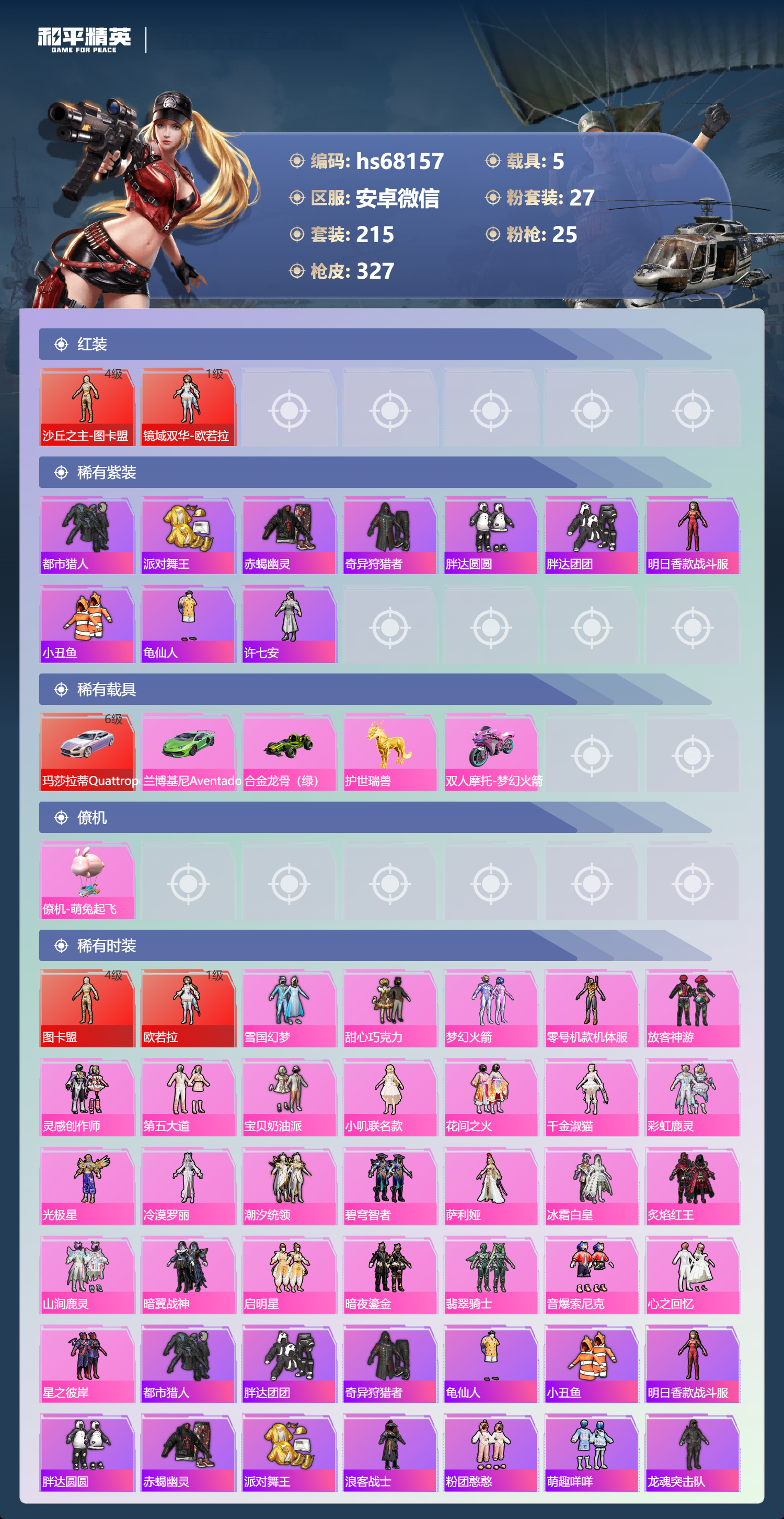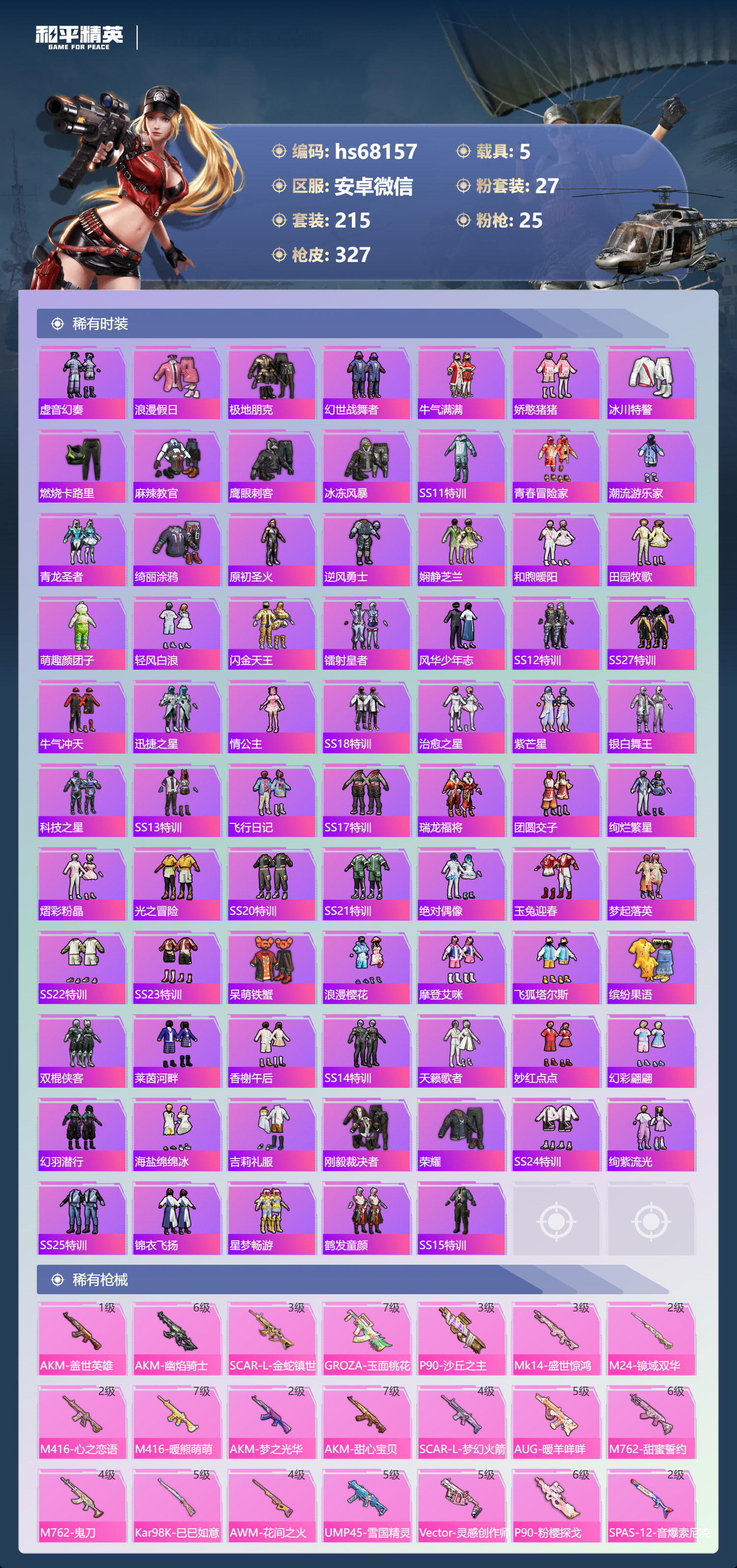 hs68157 安卓微信-24王牌印记-2红装-27粉装-25特效枪-5载具-热力值-215套装-327枪皮-1卓越印记