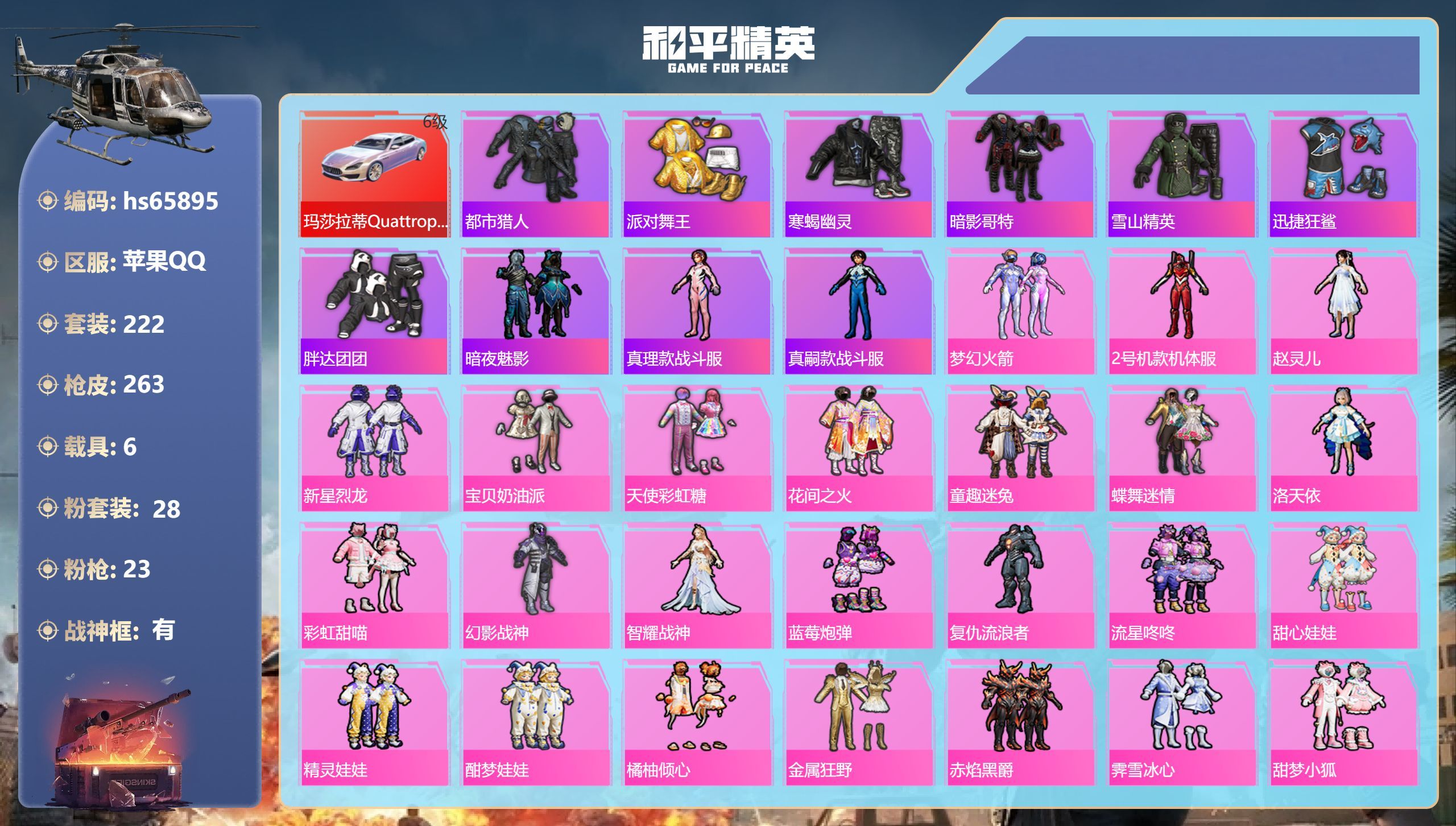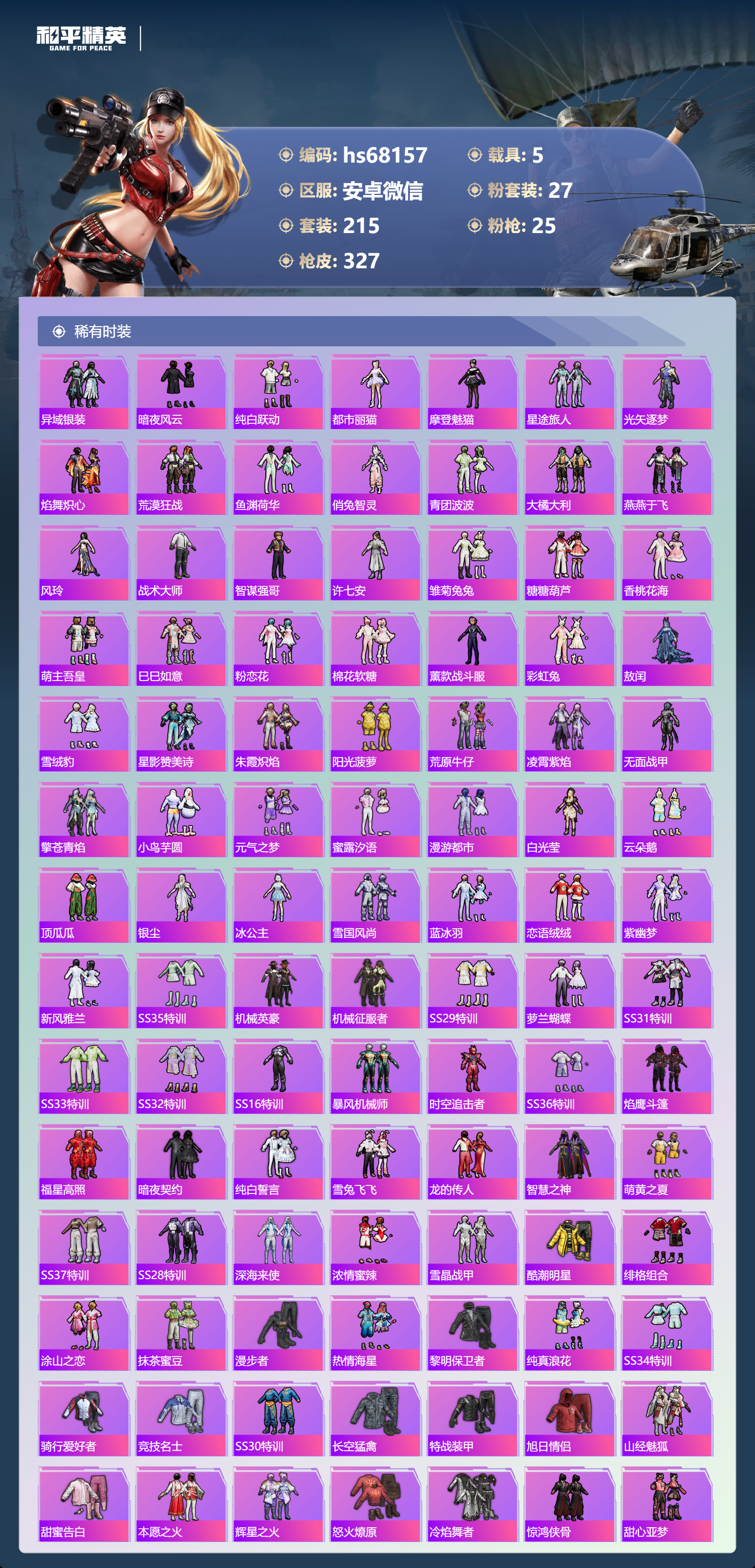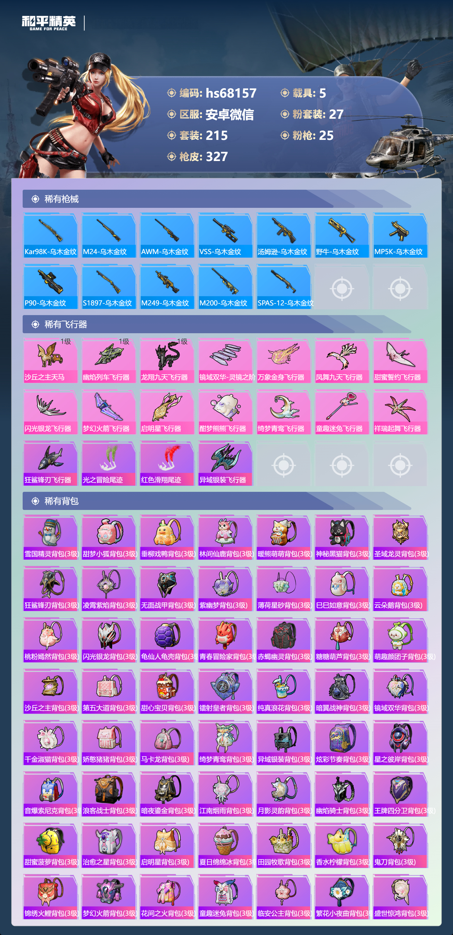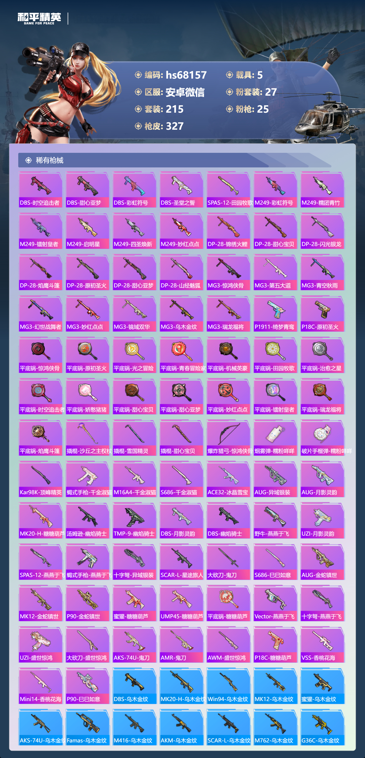 hs68157 安卓微信-24王牌印记-2红装-27粉装-25特效枪-5载具-热力值-215套装-327枪皮-1卓越印记