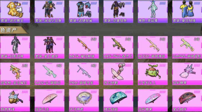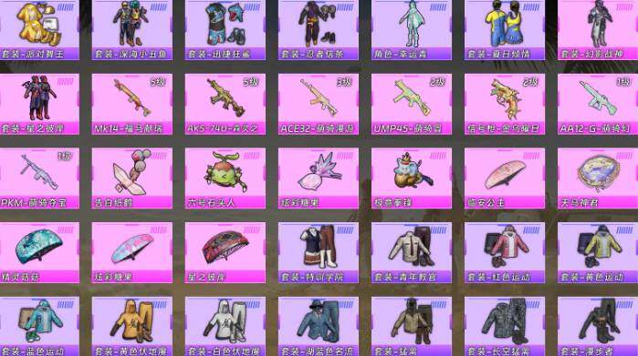 【粉色枪皮等级】:ACE32-萌骑漫游(三级),UMP45-萌骑冒险(二级),AKS-74U-森灵之息(五级),Mk14-福马献瑞(五级),AA12-G-萌骑幻想(一级),PKM-萌骑夺宝(一级),信号枪-金乌曜日(二级)