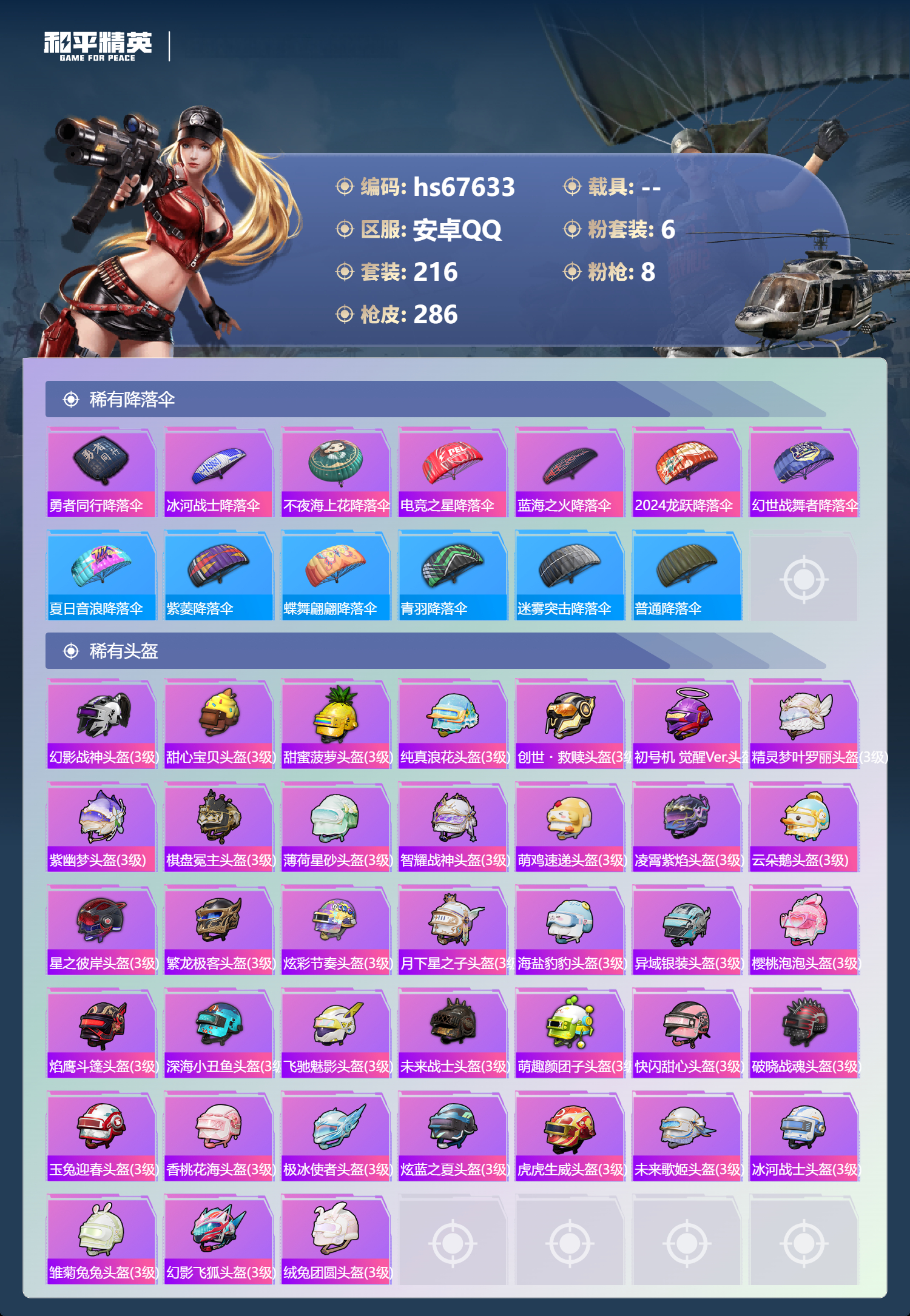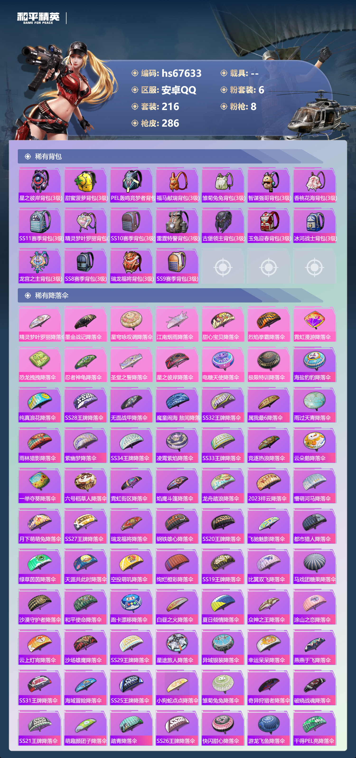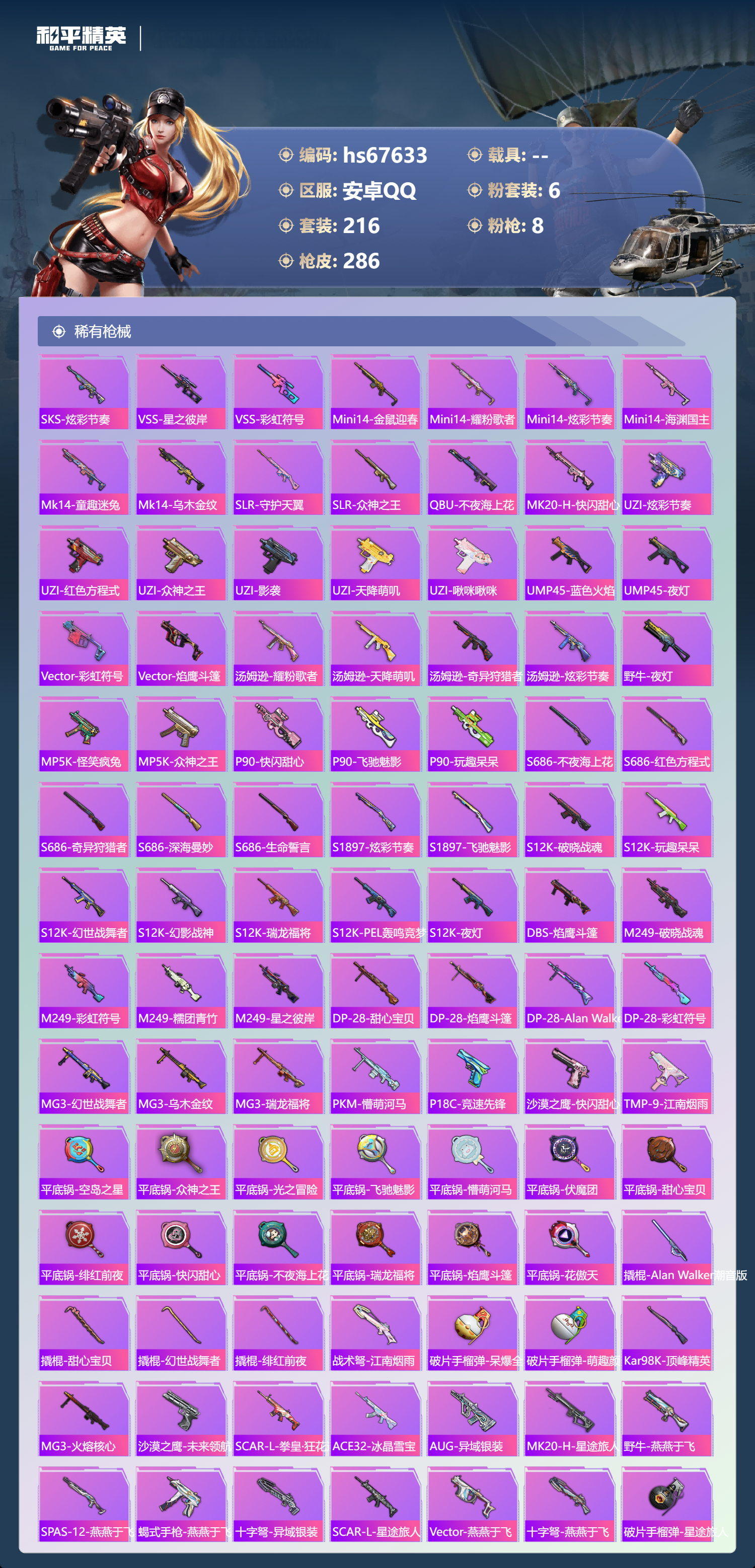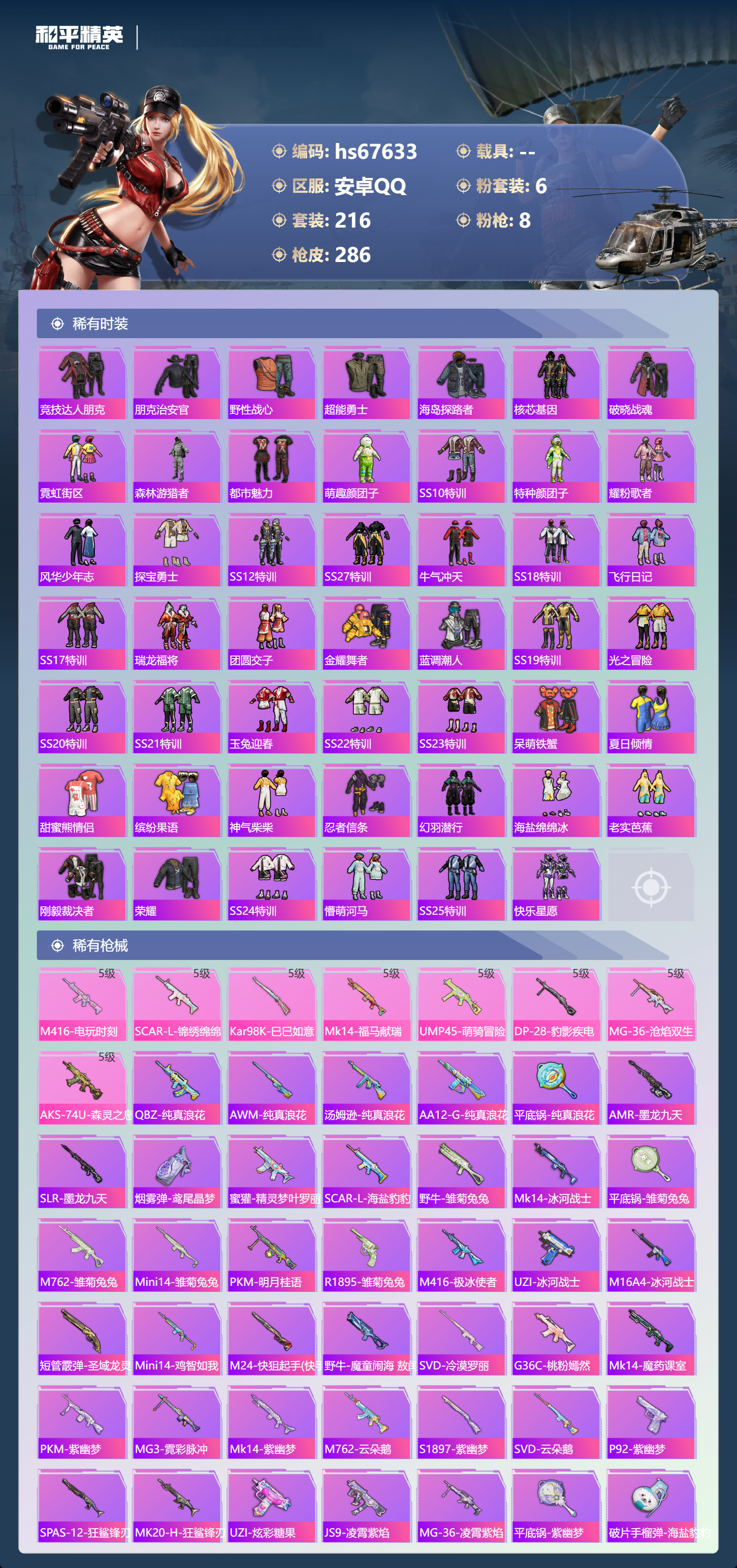hs67633 安卓手Q-13王牌印记-6粉装-8特效枪-83952热力值-216套装-286枪皮-1卓越印记