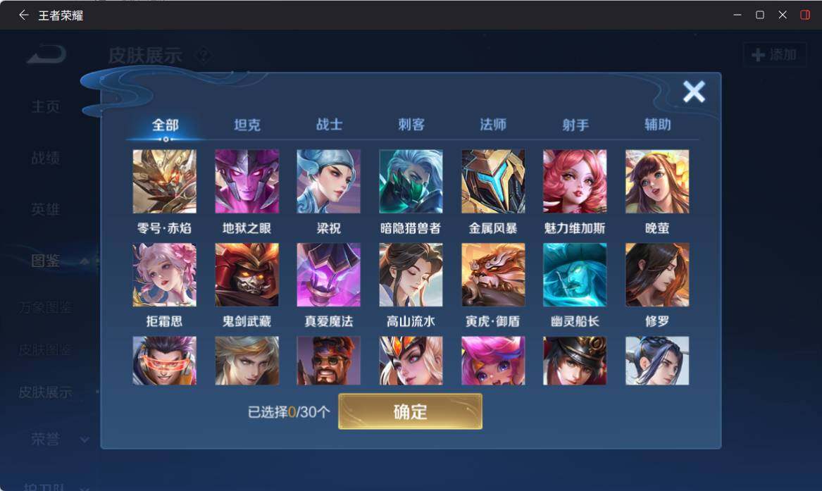 【限定皮肤】:狄仁杰阴阳师,廉颇寅虎御盾,赵云皇家上将,庄周高山流水,芈月幻夜卜梦,达摩沙漠行僧,项羽海滩派对,韩信傲雪梅枪,王昭君午后时光,兰陵王金庭之子,孙悟空零号赤焰,后羿圣弓游侠,干将莫邪真爱魔法,黄忠火炮绅士,苏烈千