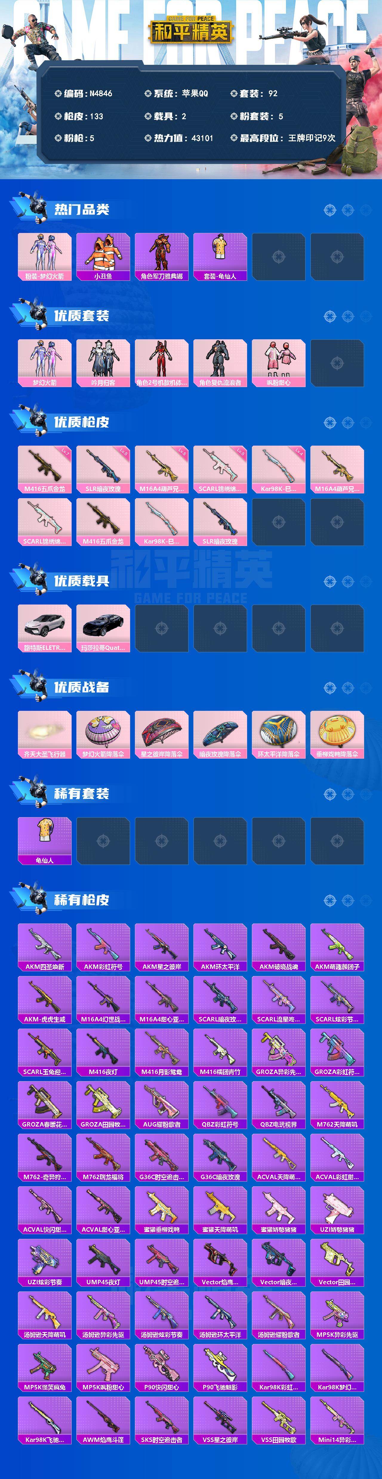 苹果 手Q-5粉装-5特效枪-2载具-1粉色飞行器-43101热力值-9王牌印记-92套装-133枪皮