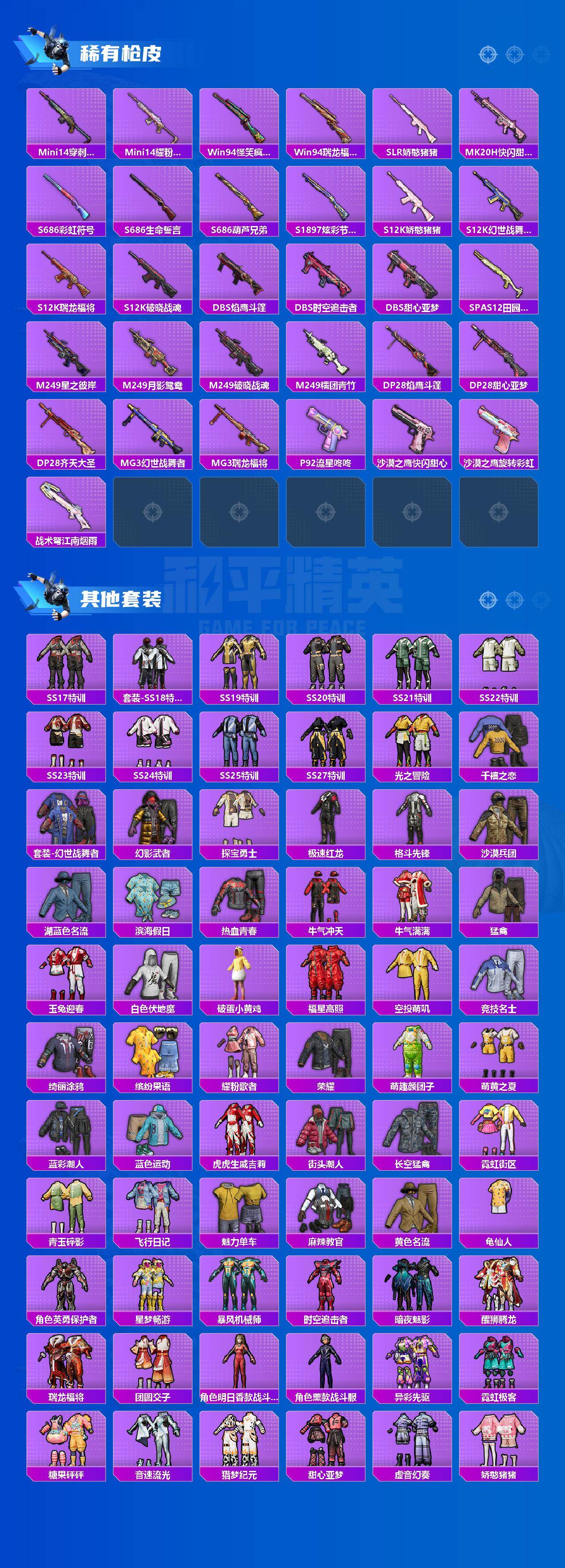 【粉色枪皮等级】:M16A4-葫芦兄弟(五级),SCAR-L-锦绣绵绵(五级),M416-五爪金龙(七级),Kar98K-巳巳如意(四级),SLR-暗夜玫瑰(五级)