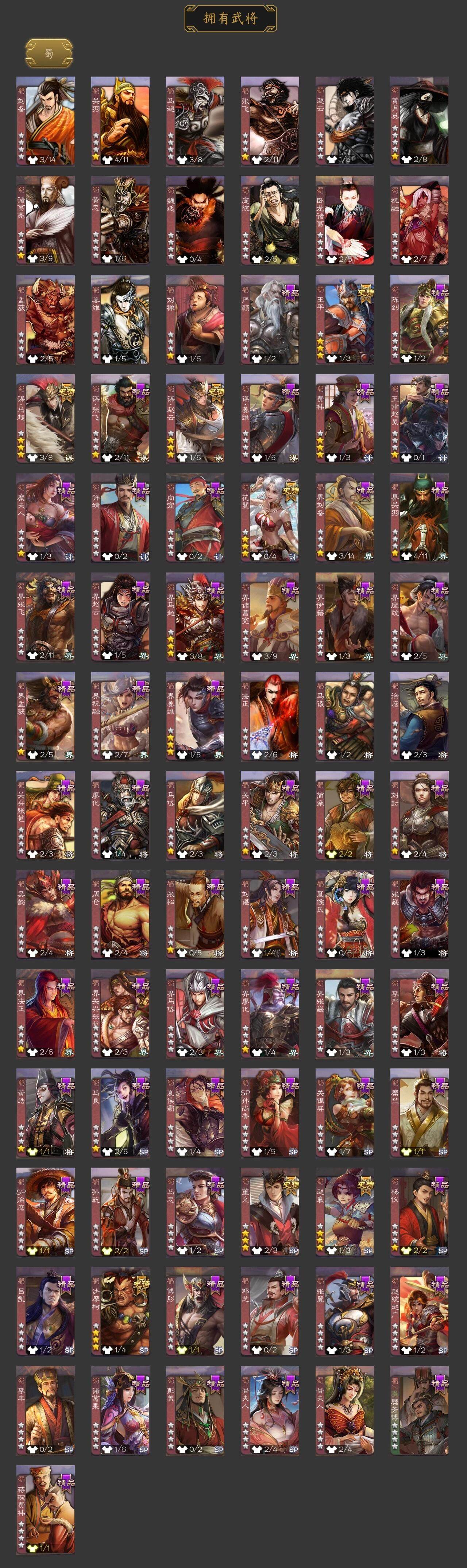 官阶:大将军;VIP等级:VIP9;史诗武将数量:37;动态皮肤数量:25;武将总数:345;史诗宝珠数量:0;将魂数量:6143;神将:4;魏国史诗武将:16;蜀国史诗武将:7;吴国史诗武将:8;群史诗武将:14