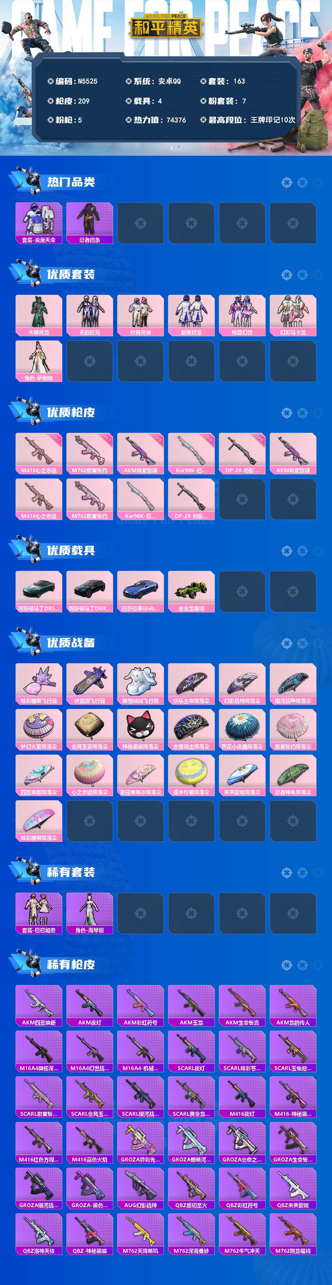 安卓 手Q-7粉装-5特效枪-4载具-3粉色飞行器-74376热力值-10王牌印记-163套装-209枪皮