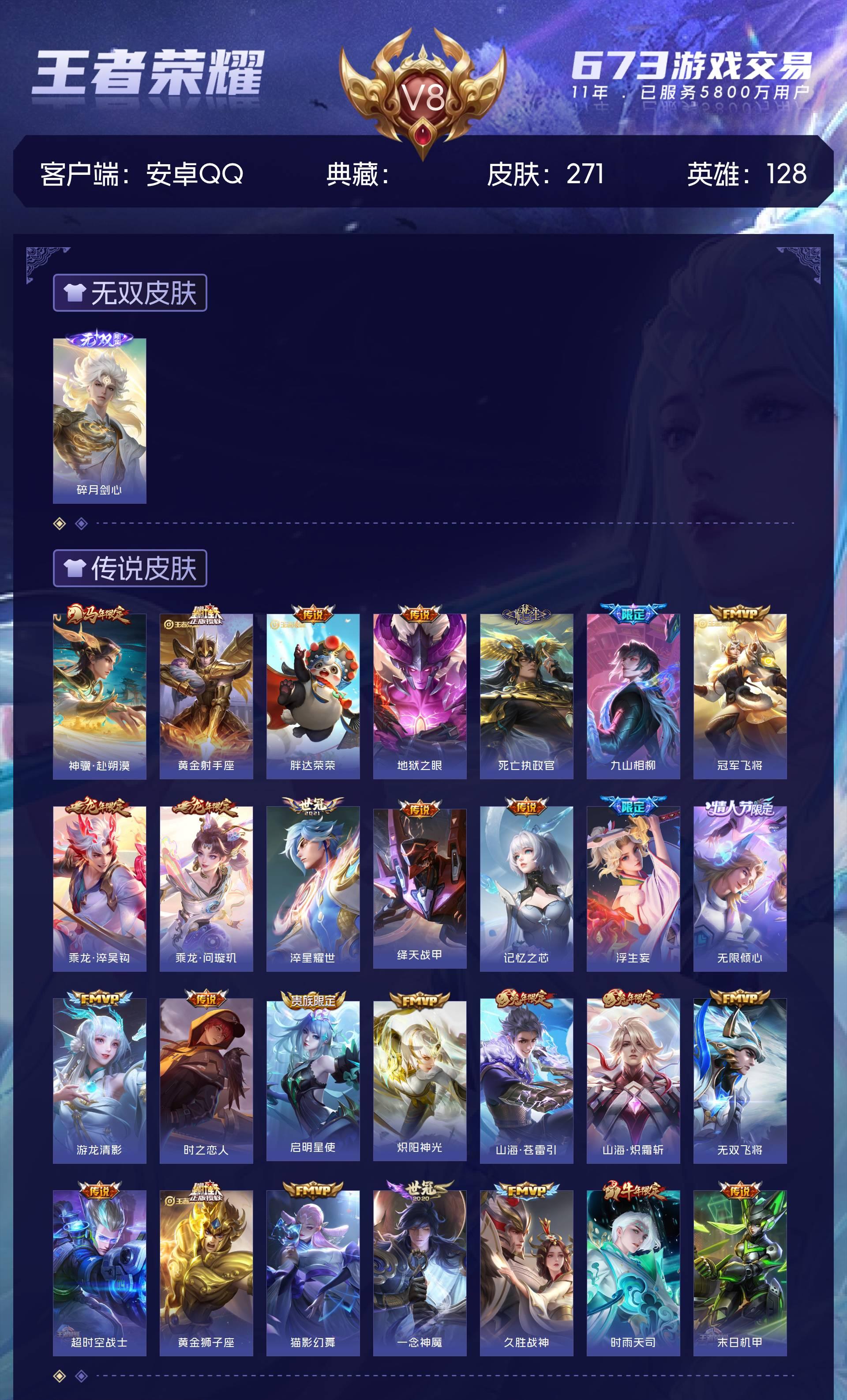 V8 皮肤271 英雄128 至尊星耀 无双皮肤1 星传说3 传说29