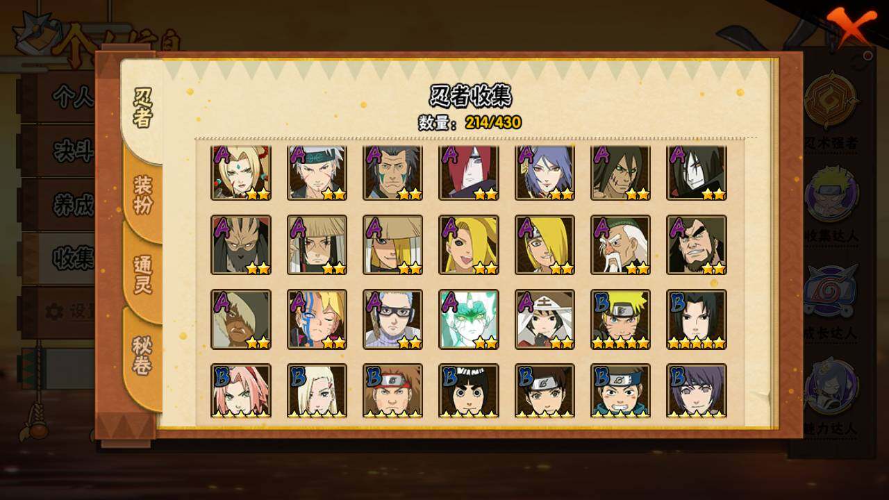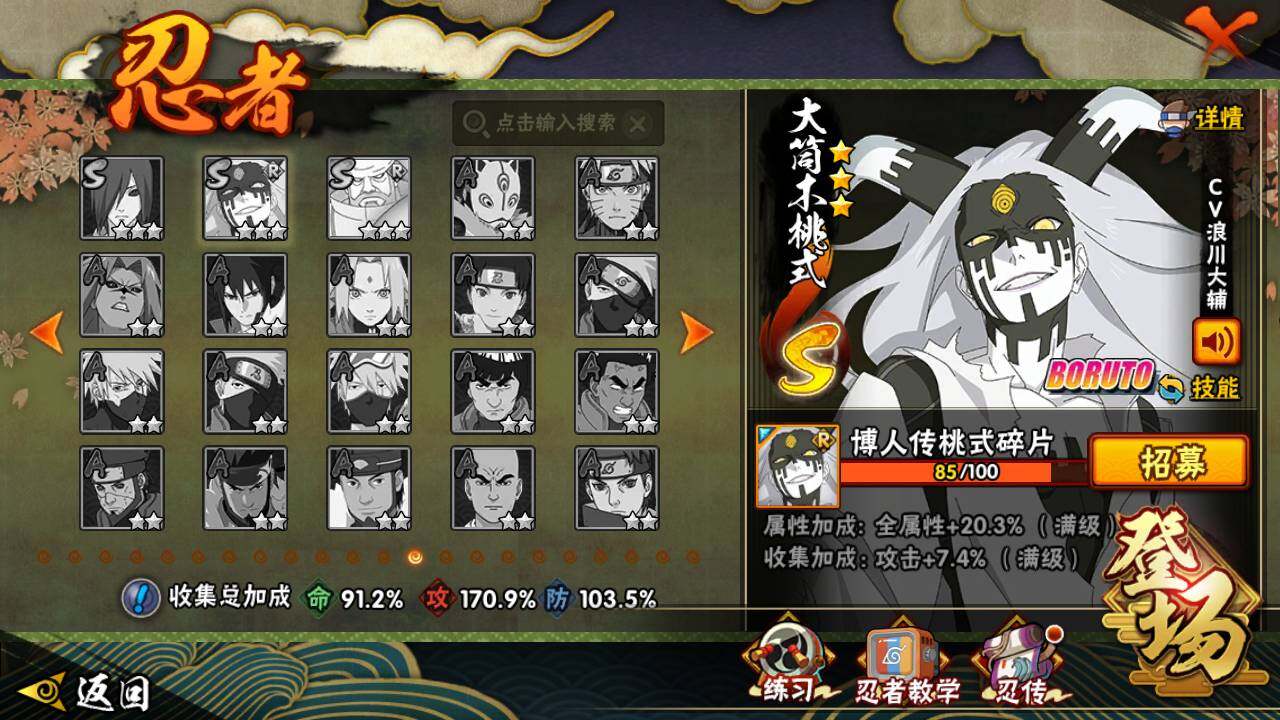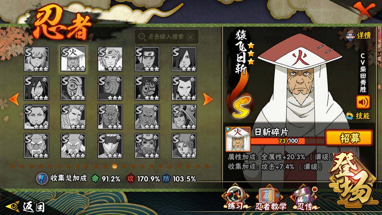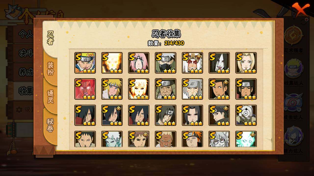 【S级忍者】:猿飞日斩「秽土转生」(3星),千手扉间「秽土转生」(3星),千手柱间「秽土转生」(3星),宇智波鼬「秽土转生」(3星),宇智波斑「秽土转生」(3星),宇智波斑「秽土转生·解」(3星),春野樱「忍界大战」(3星),宇智波带土「忍界大战」(3星),艾「忍界大战」(3星),宇