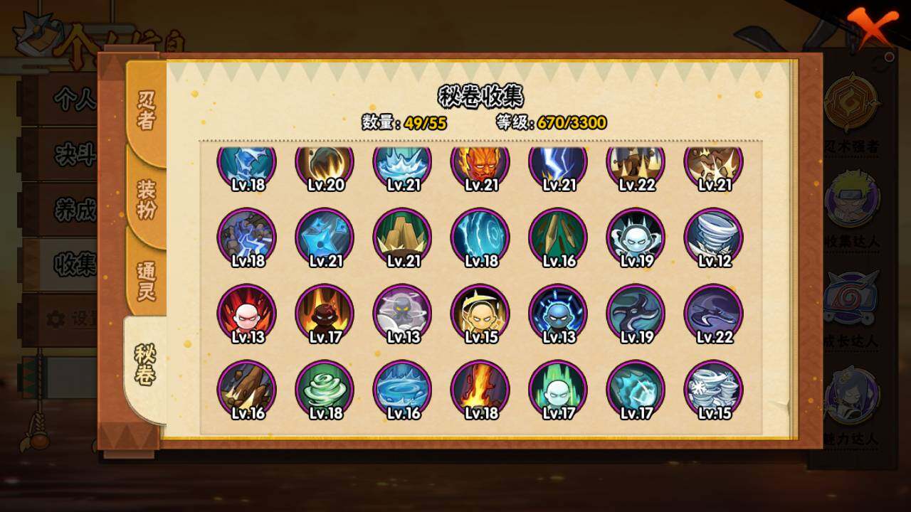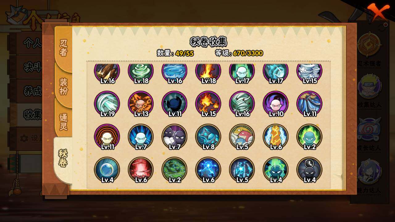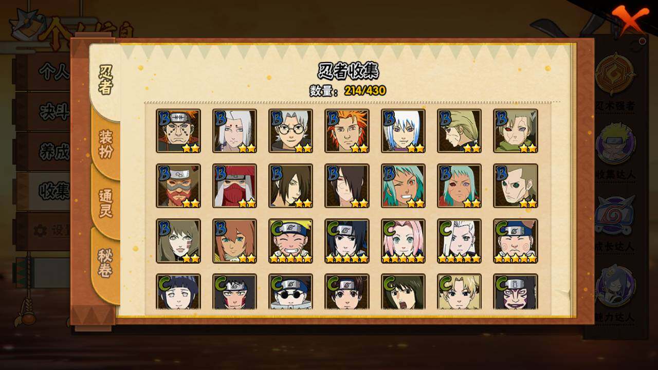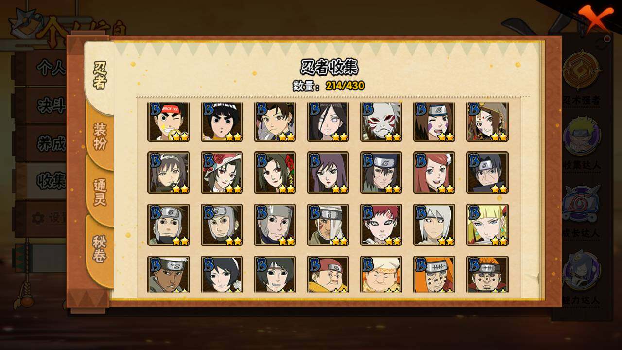 【S级忍者】:猿飞日斩「秽土转生」(3星),千手扉间「秽土转生」(3星),千手柱间「秽土转生」(3星),宇智波鼬「秽土转生」(3星),宇智波斑「秽土转生」(3星),宇智波斑「秽土转生·解」(3星),春野樱「忍界大战」(3星),宇智波带土「忍界大战」(3星),艾「忍界大战」(3星),宇
