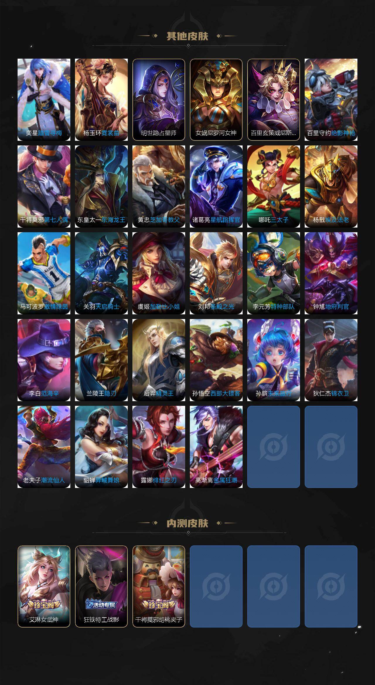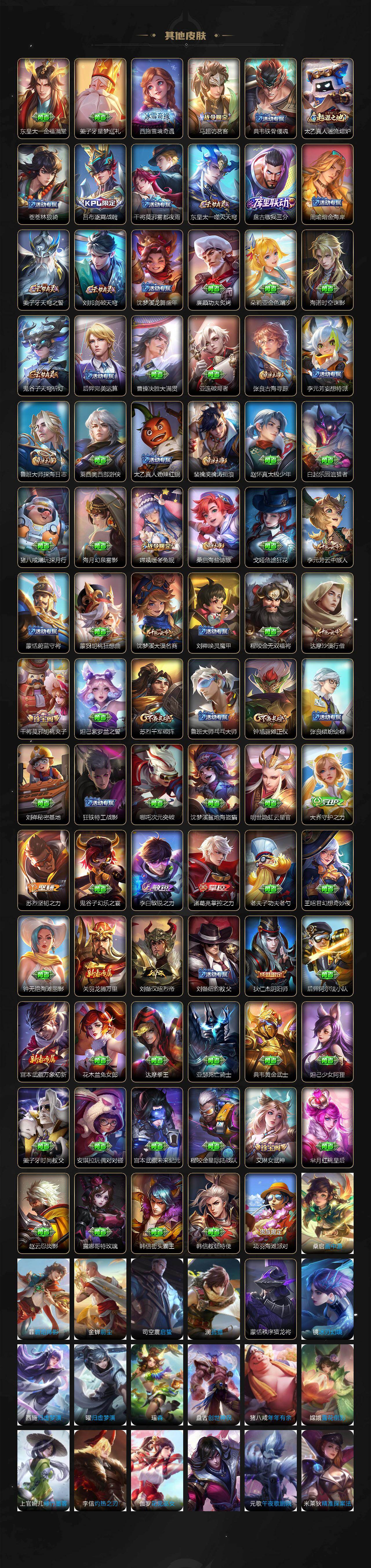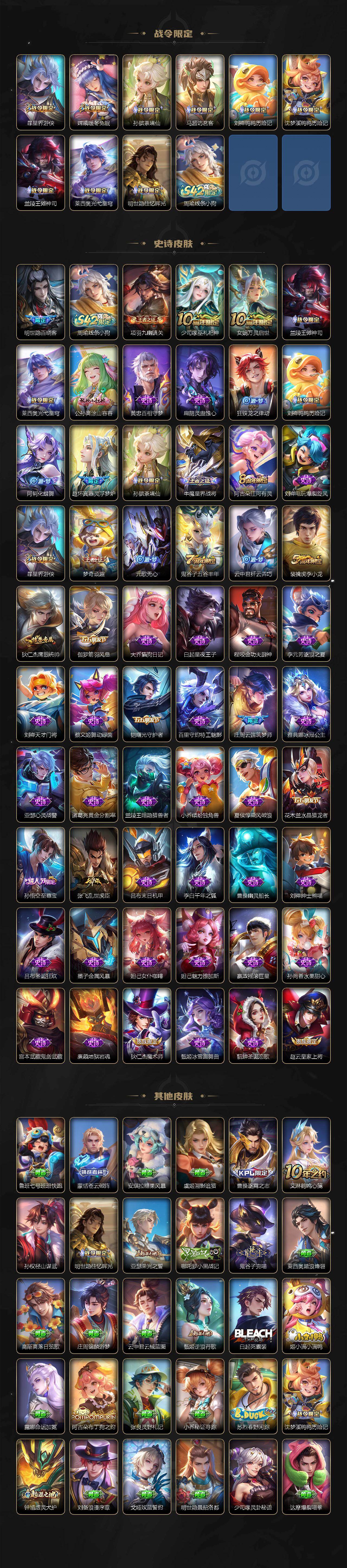 【传说皮肤】:后羿神树通天,司空震愿照山河定,女娲愿照千秋盛,妲己愿照众生和,澜愿照九州拓,蔡文姬愿照福禄聚,虞姬愿照岁时盈,云缨幻光神枪,桑启鸣野蒿,赵云乘龙铭钟鼎,李信山海炽霜斩,干将莫邪久胜战神,达摩黄金狮子座,宫本武藏地狱之眼