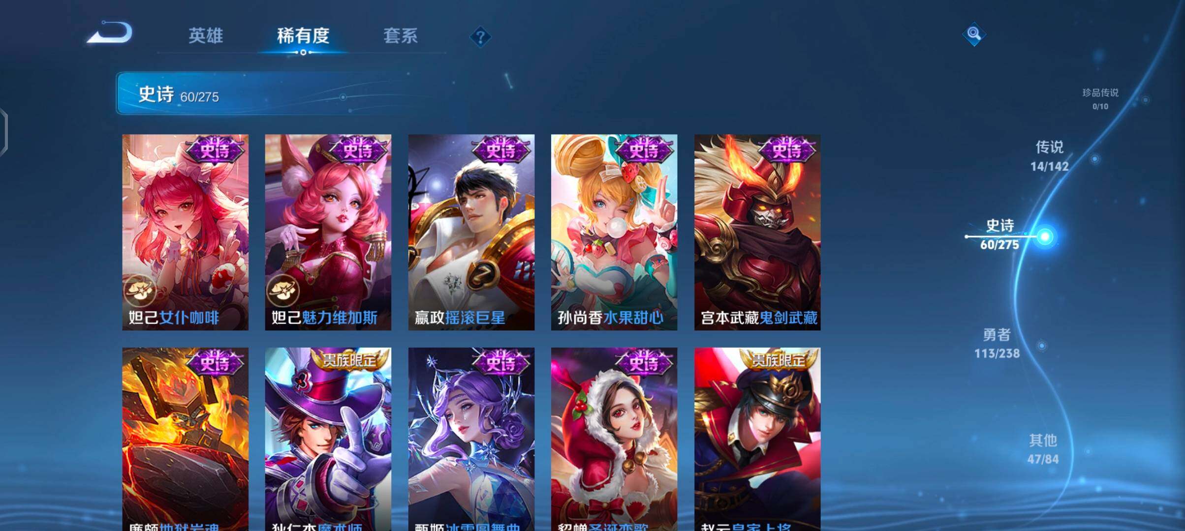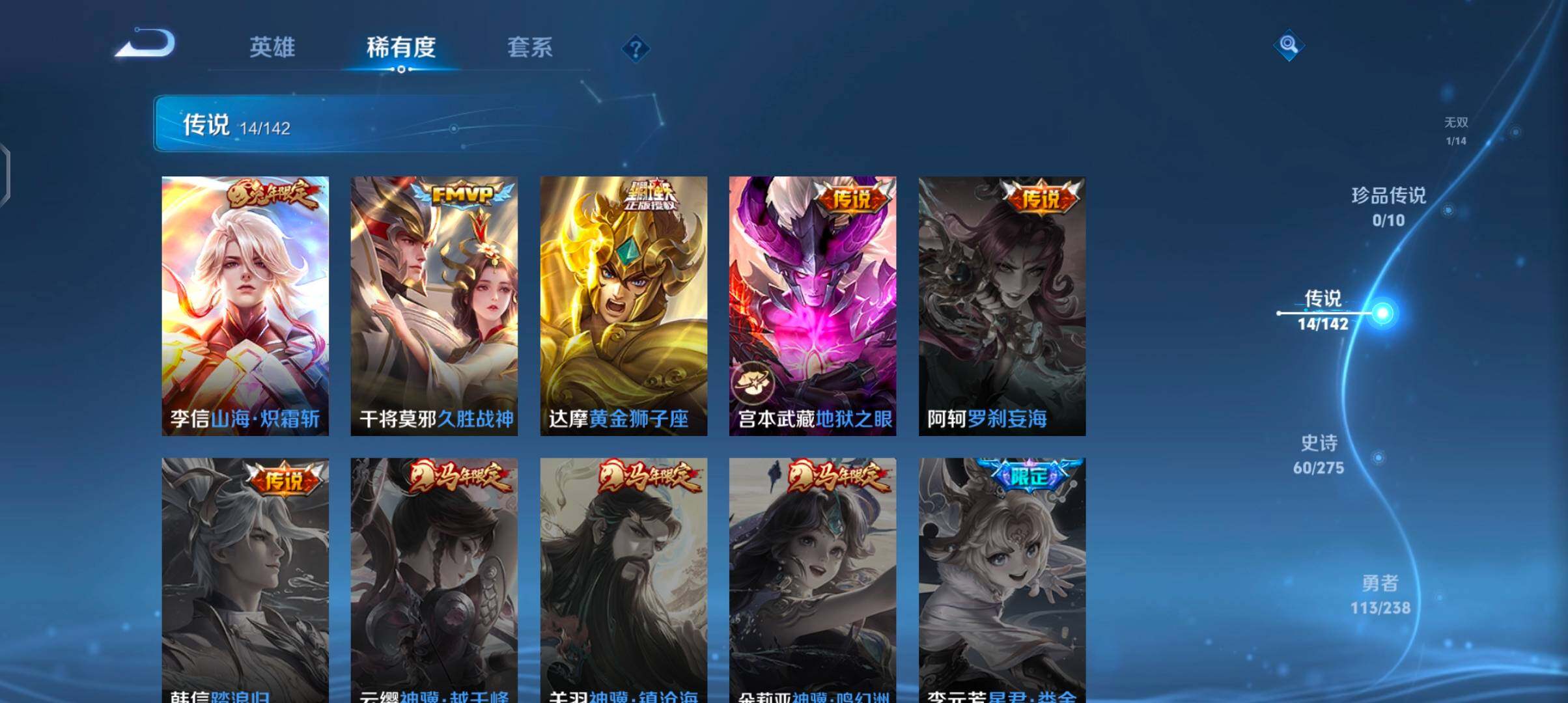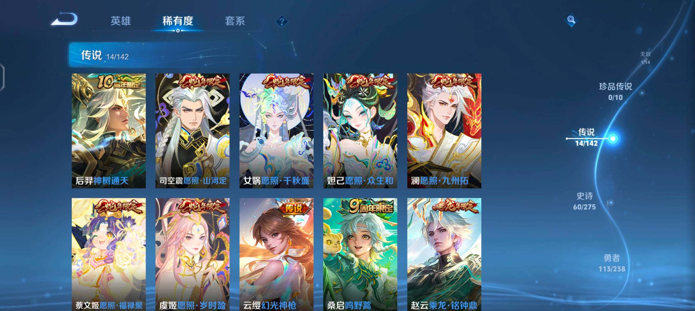 【传说皮肤】:后羿神树通天,司空震愿照山河定,女娲愿照千秋盛,妲己愿照众生和,澜愿照九州拓,蔡文姬愿照福禄聚,虞姬愿照岁时盈,云缨幻光神枪,桑启鸣野蒿,赵云乘龙铭钟鼎,李信山海炽霜斩,干将莫邪久胜战神,达摩黄金狮子座,宫本武藏地狱之眼