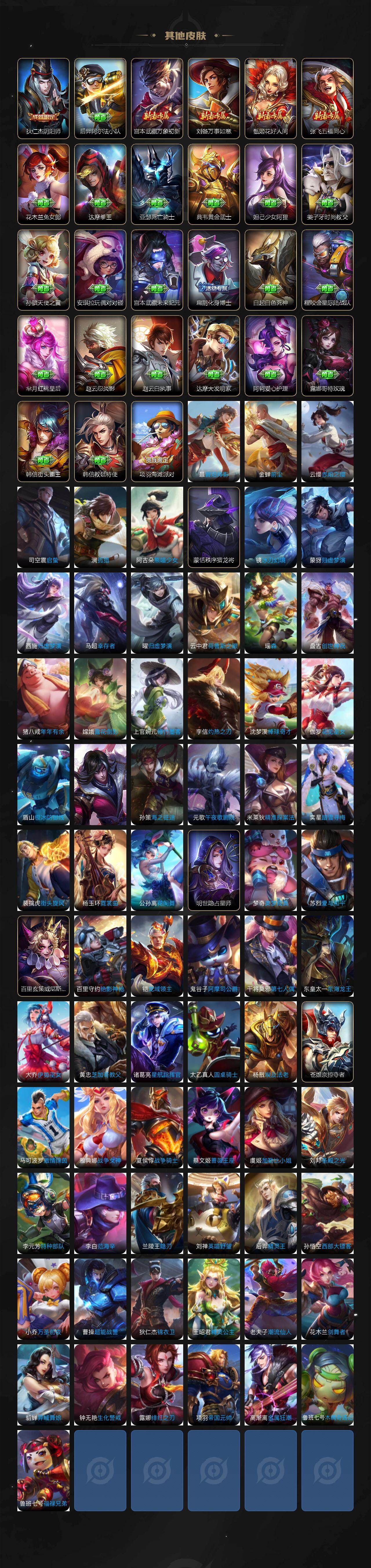 【限定皮肤】:铠冥王哈迪斯,暃埋骨钱,蒙犽顽岩魄,大乔绒语心约,姜子牙天穹之誓,李白谪仙醉月,狄仁杰阴阳师,赵云皇家上将,墨子降魔,嬴政优雅恋人,鲁班七号狮舞东方,阿轲迷踪丽影,钟无艳超时空战士,周瑜