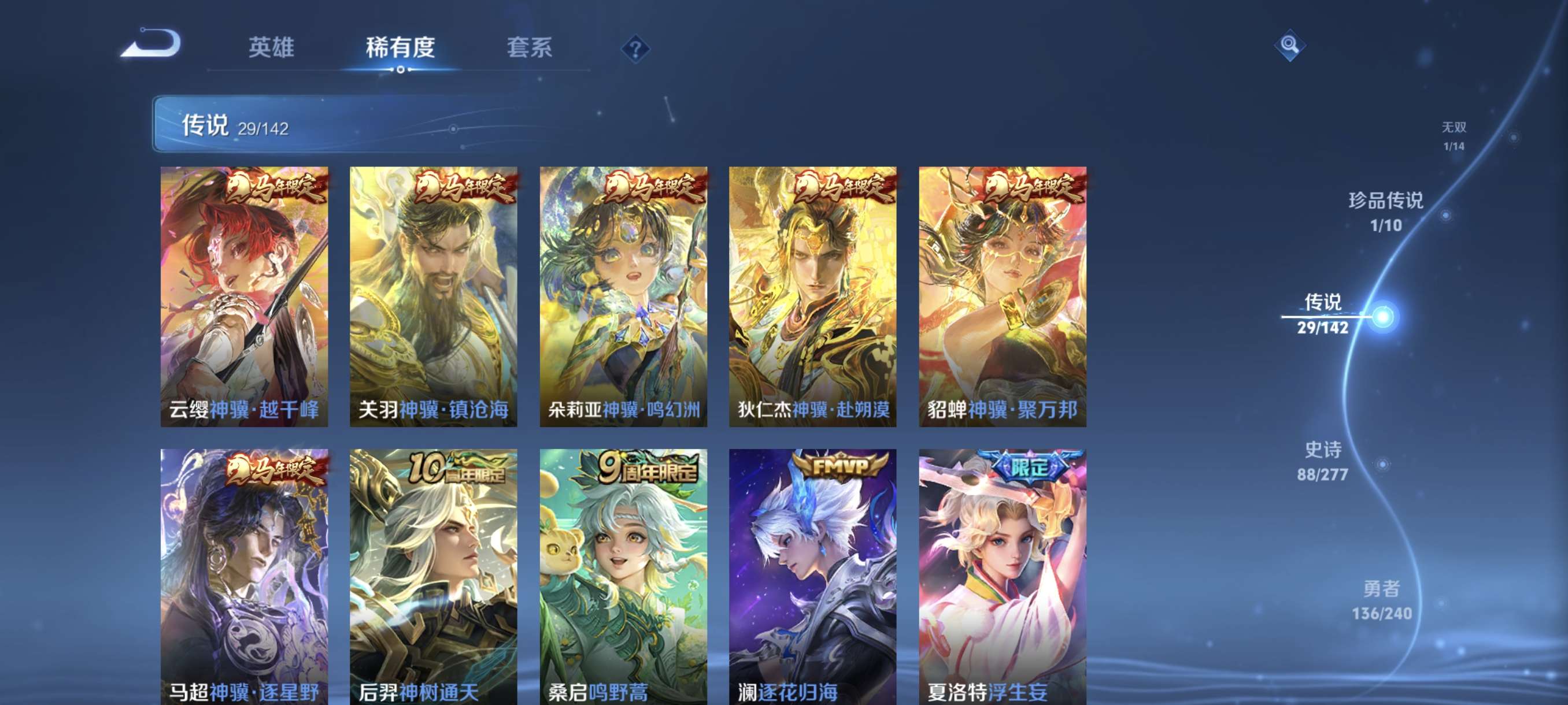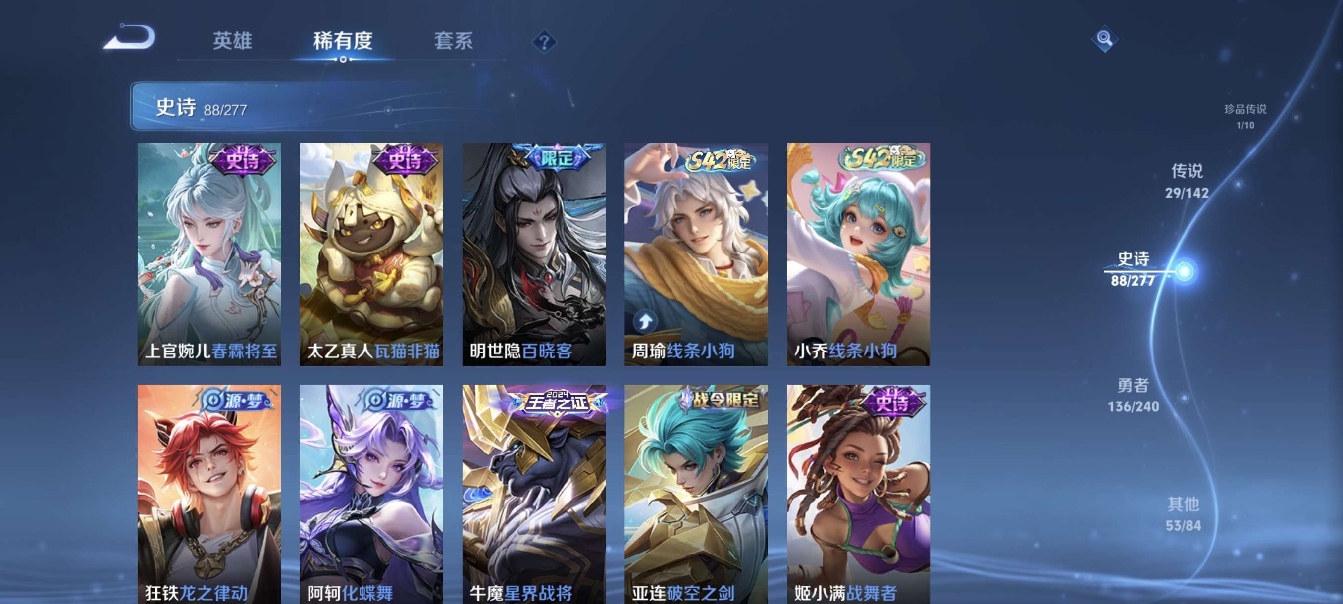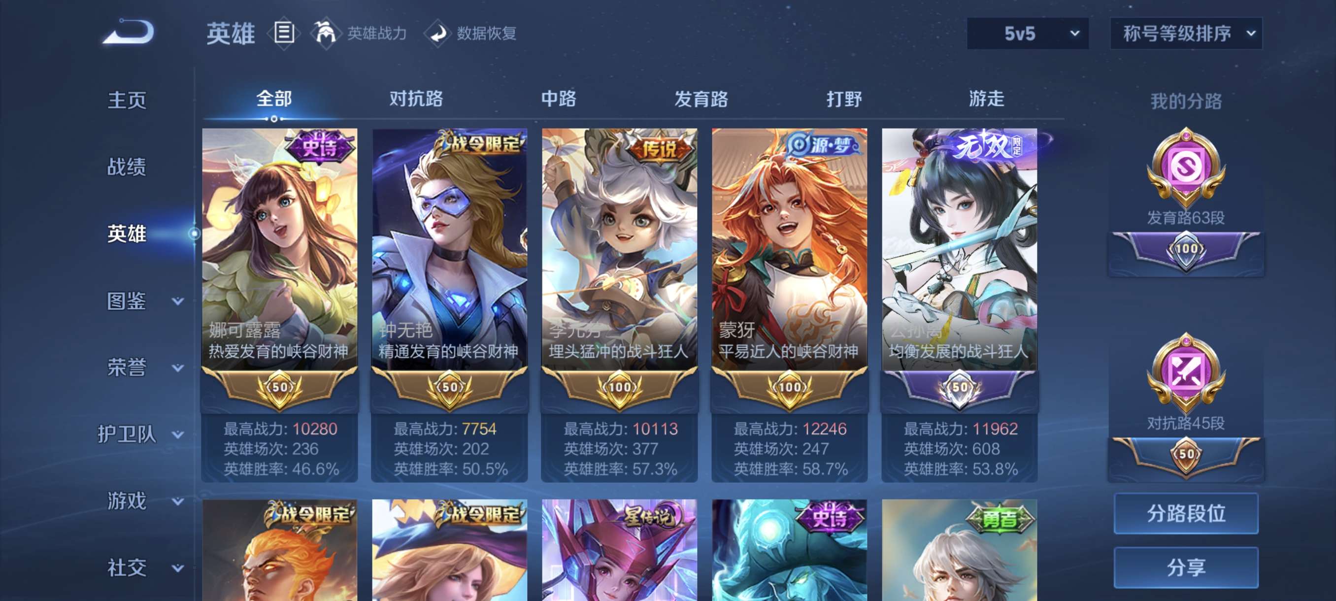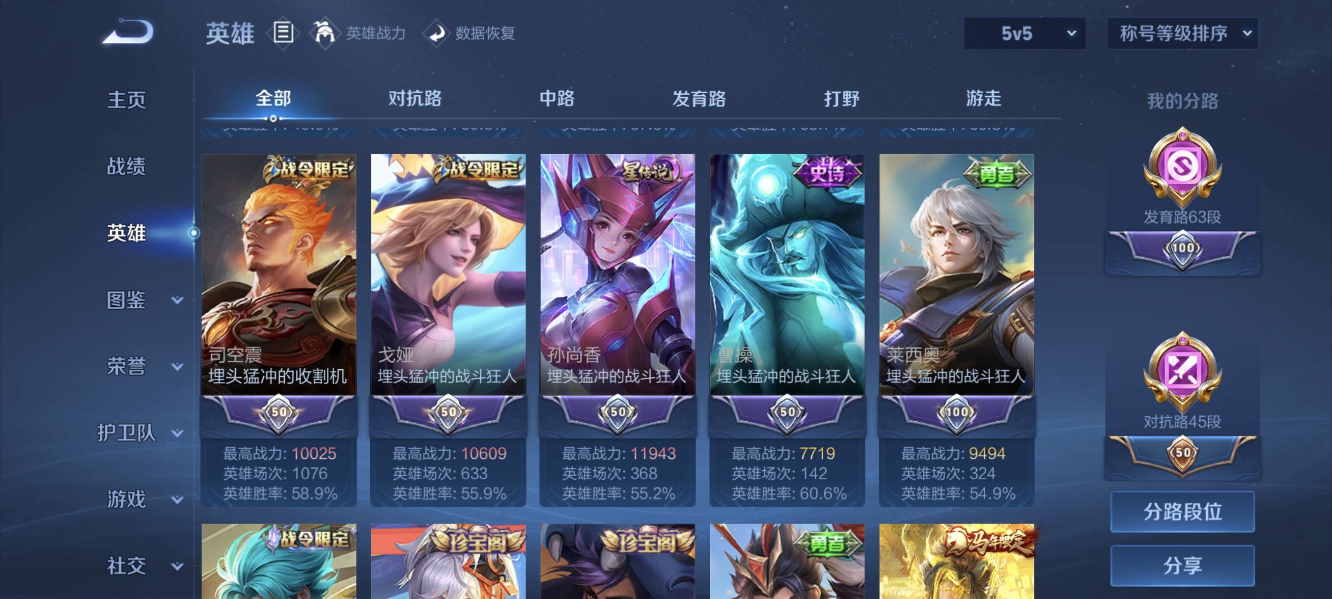 63段发育路,45对抗路,40打野,有顶级发育路称号,有公孙离无双,全套马年,全套马年金色闪光海报