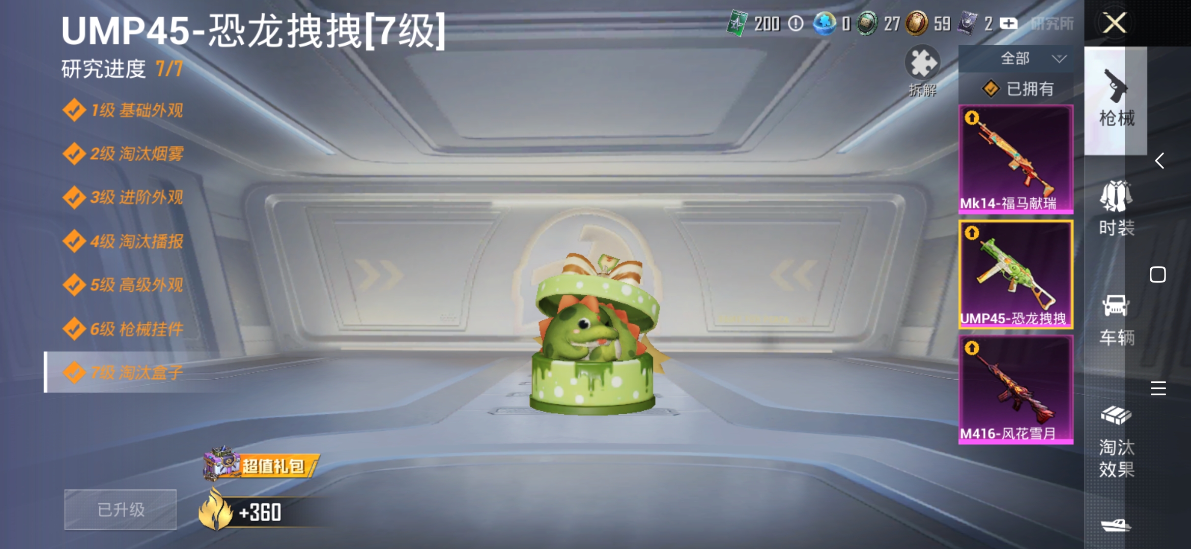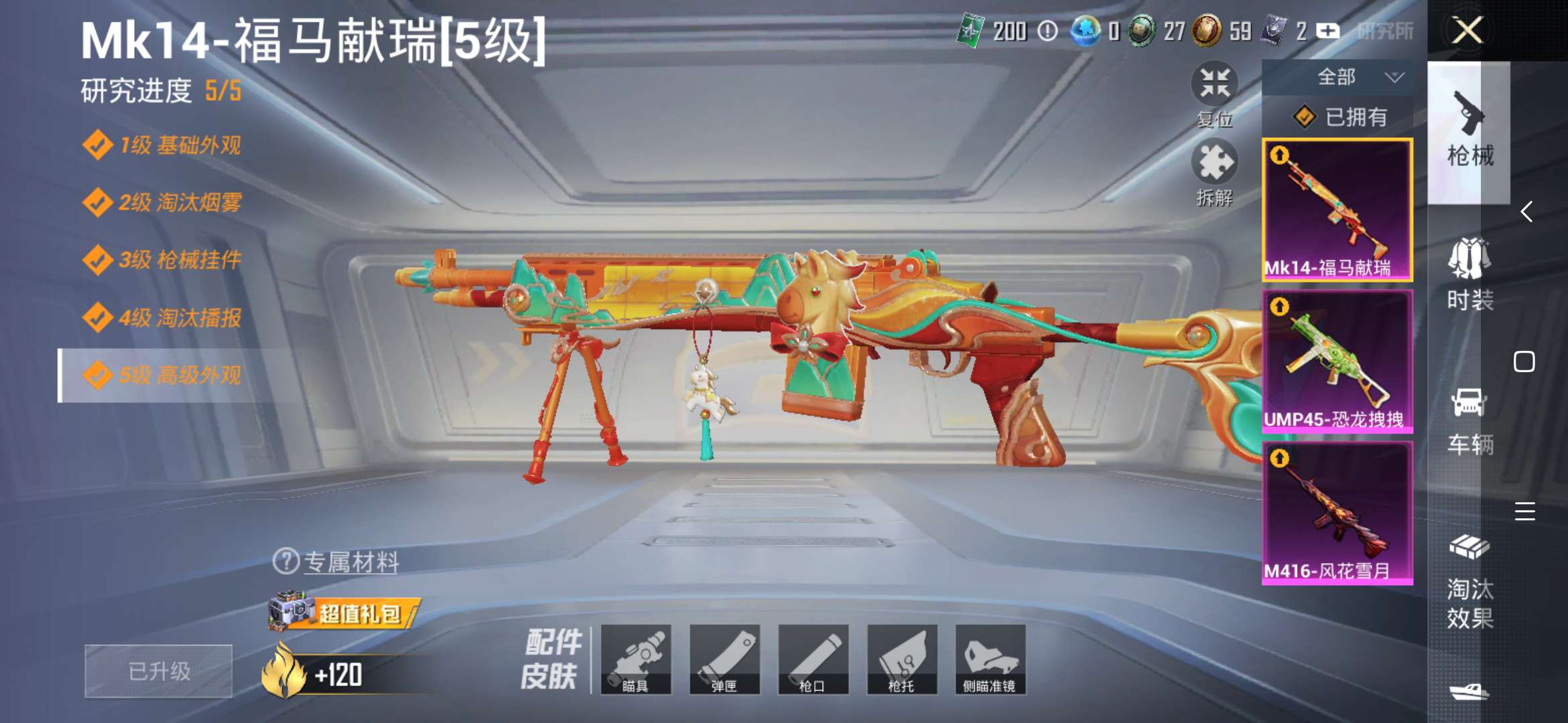 m416风花雪月、ump45恐龙拽拽、scar淘汰效果镭射皇者