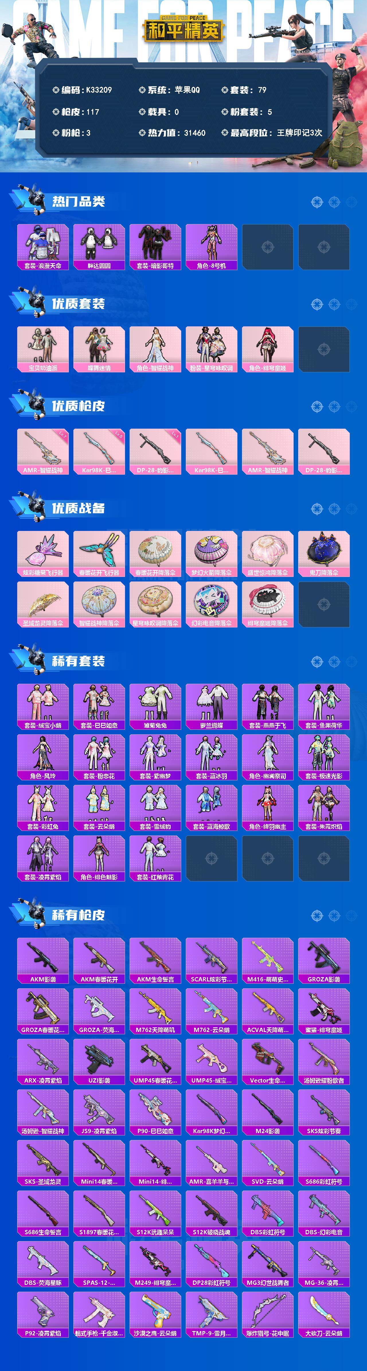 苹果 手Q-5粉装-3特效枪-0载具-2粉色飞行器-31460热力值-3王牌印记-79套装-117枪皮