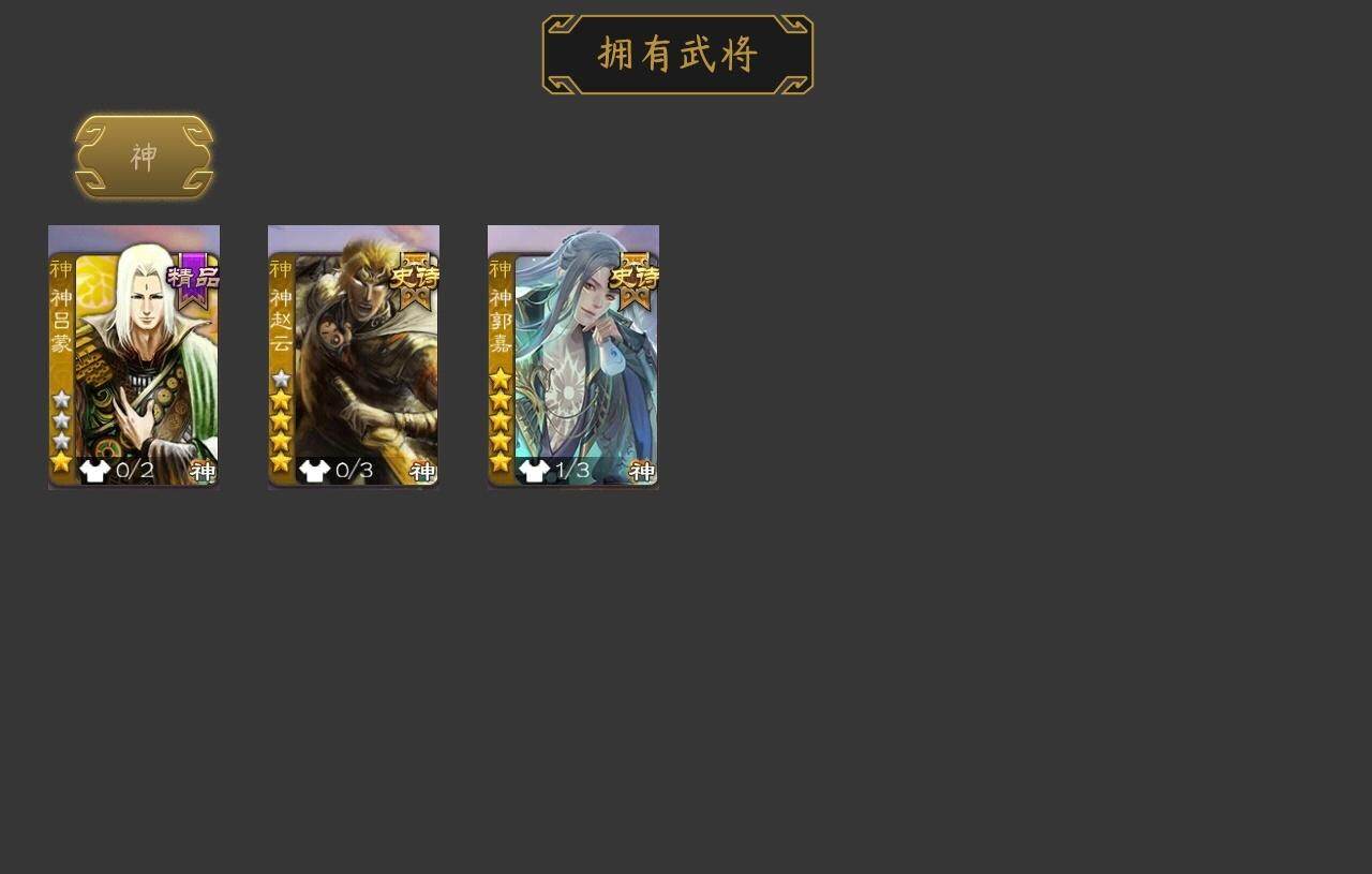 神赵云,神郭嘉,谋曹仁,界钟会,曹纯,程昱,谋夏侯氏,界黄忠,花鬘,谋黄盖,界徐盛,兀突骨,神吕蒙,SP关羽,SP蔡文姬,乐进,曹昂,诸葛诞,朱灵,文聘,SP姜维,张春华,钟会,曹冲,