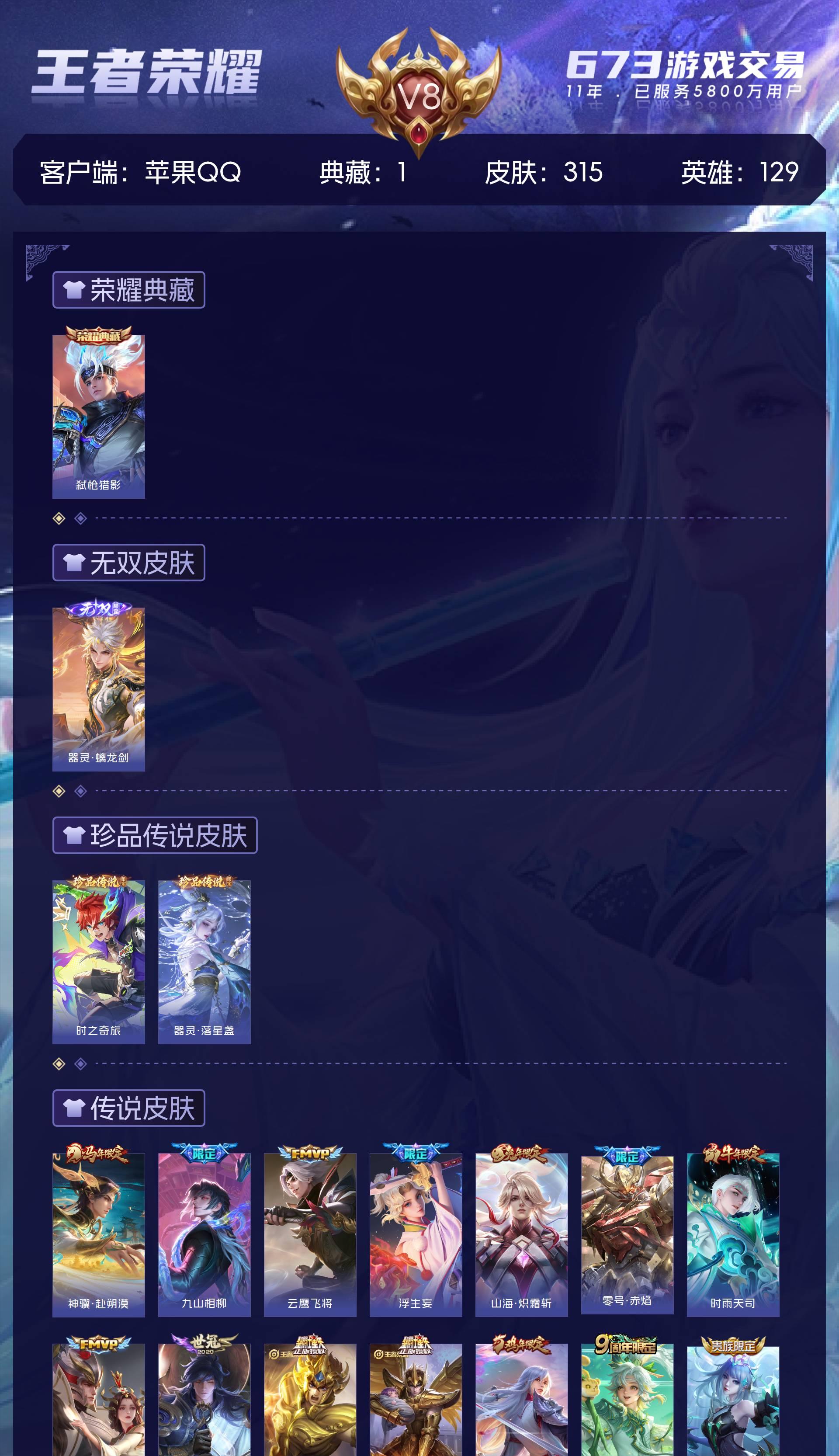 V8 皮肤315 英雄129 永恒钻石 荣耀典藏1 无双皮肤1 珍品传说2 星传说1 传说24