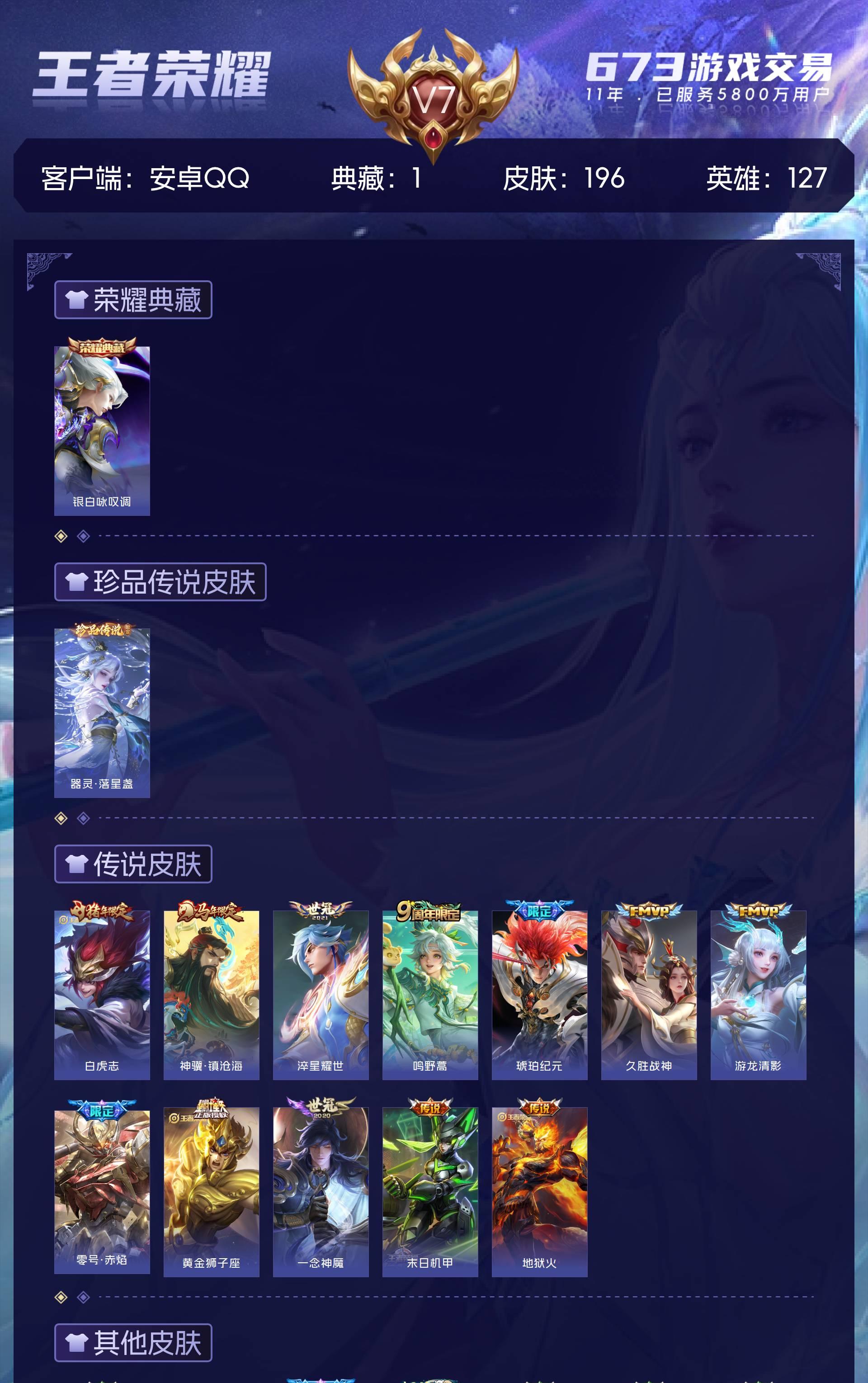 V7 皮肤196 英雄127 至尊星耀 荣耀典藏1 珍品传说1 星传说1 传说12