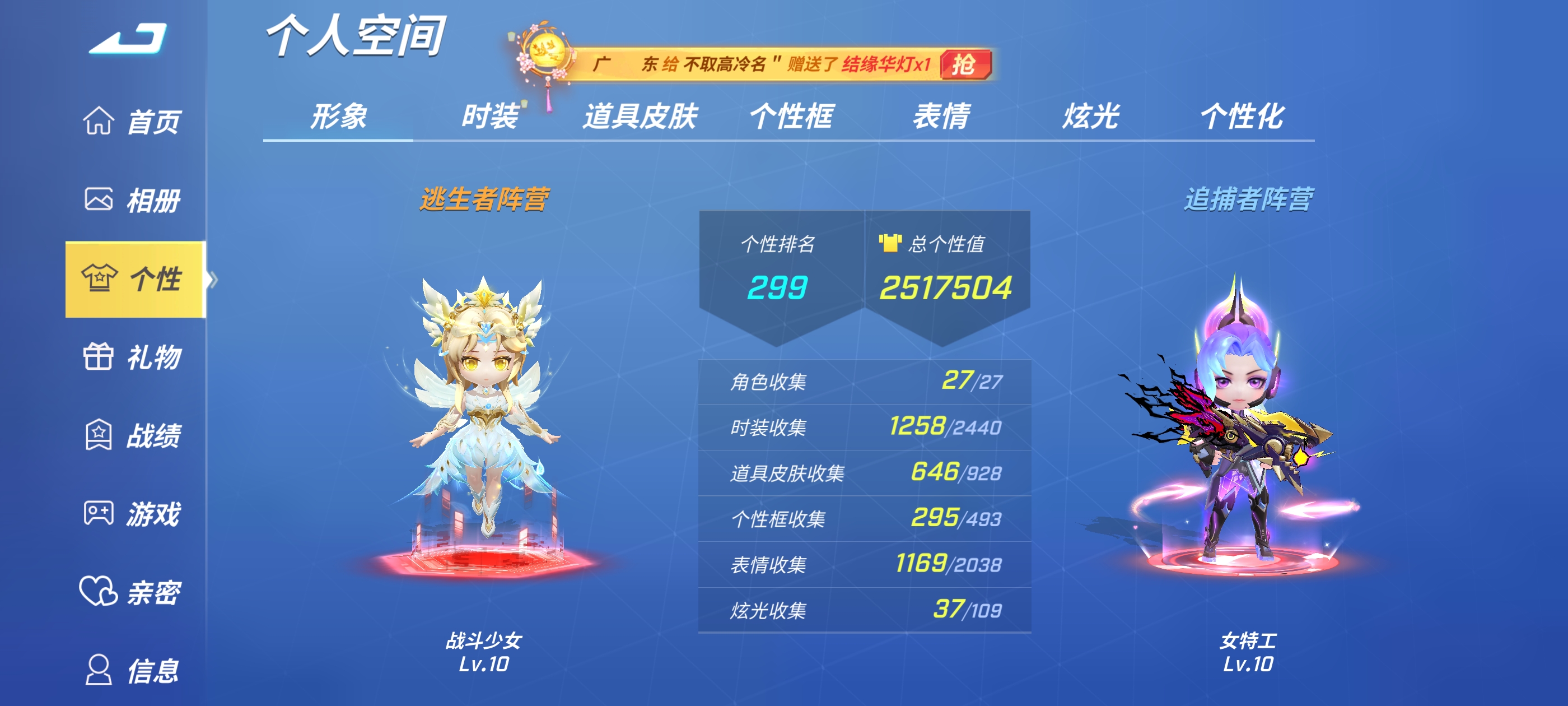 诚心卖,本人至少充值了5000,目前个性值251万,全服排名299,各种星耀绝版,礼物值200万