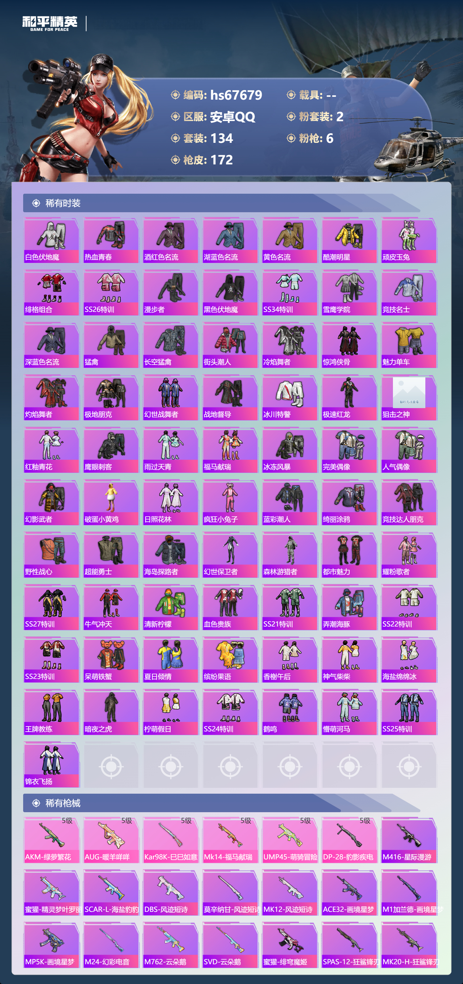 hs67679 安卓手Q-3王牌印记-1红装-2粉装-6特效枪-47038热力值-134套装-172枪皮