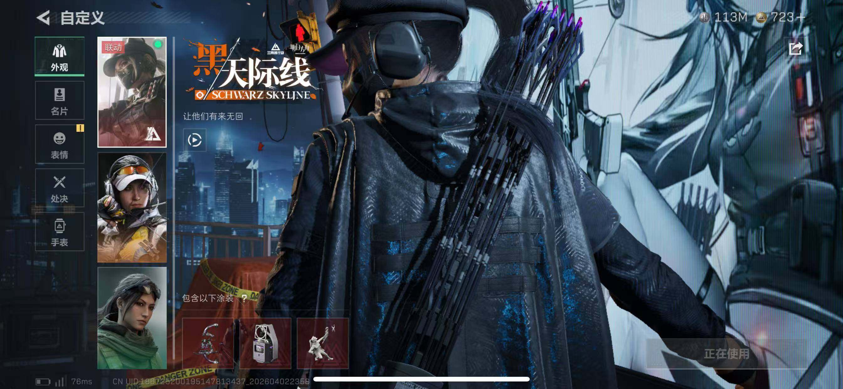 【干员外观】:红狼-蚀金玫瑰,骇爪-水墨云图,露娜-黑·天际线,蛊-能天使午夜邮差,威龙-凌霄戍卫,威龙-壮志凌云,威龙-蛟龙特战队,威龙-飞虎,蜂医-送葬人·无题密令,无名-夜鹰,深蓝-不破誓约,红狼-电锯惊魂,露娜-金牌射手,乌鲁鲁-荒原猎手,蛊-不羁人生