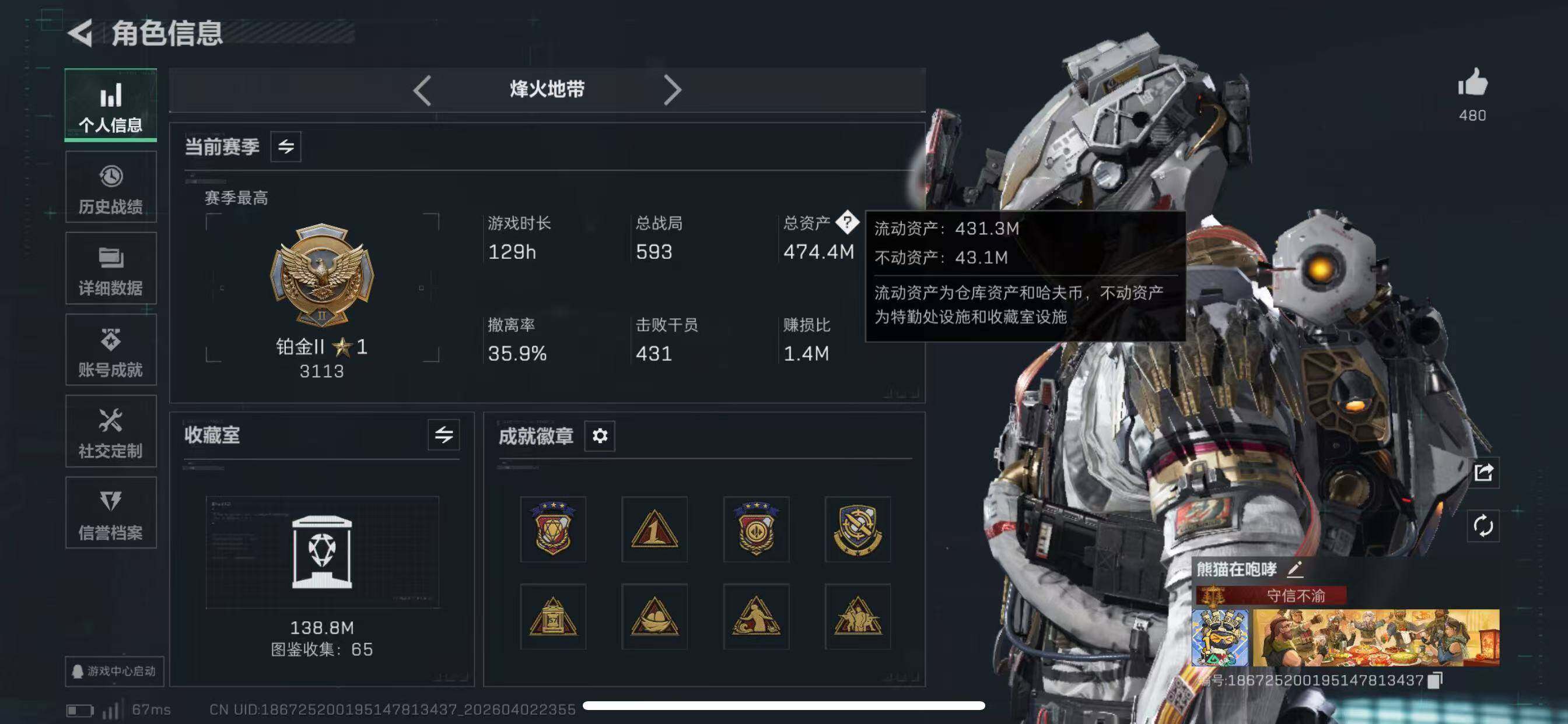 474m总资产-113490k哈夫币-60烽火等级-铂金-50战场等级-军士长