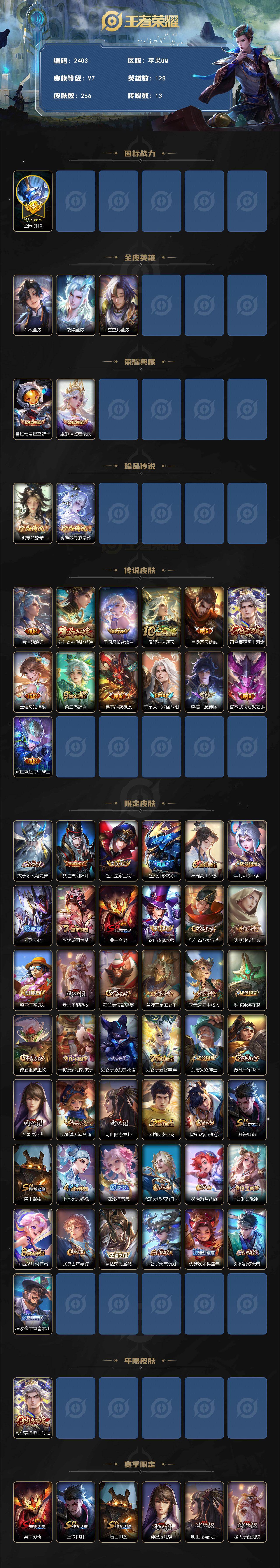 苹果Q-V7-最强王者段位-128英雄-266皮肤-2典藏皮肤-2珍品传说-13传说-64史诗