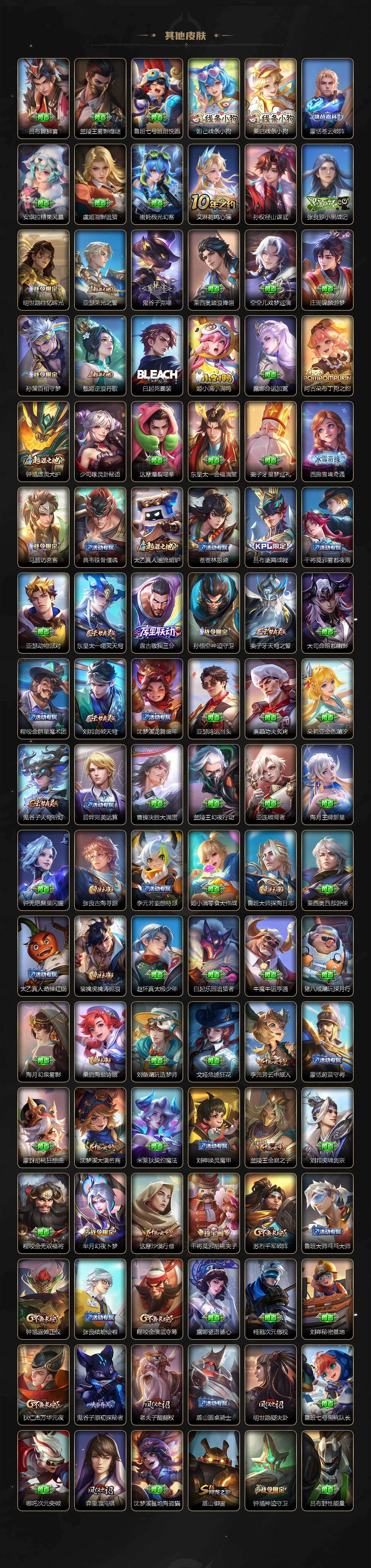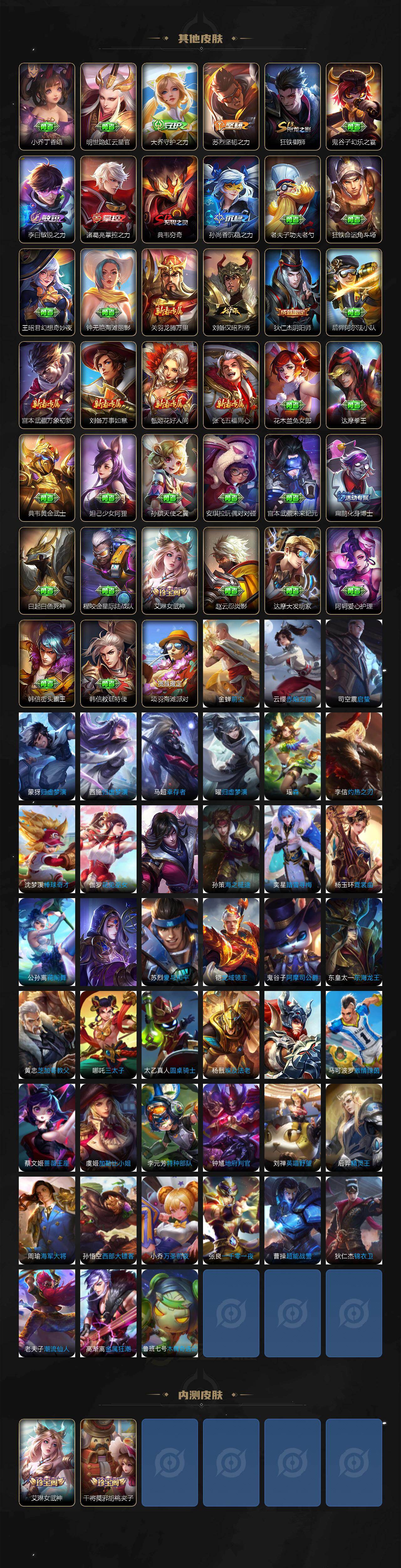 【传说皮肤】:韩信踏浪归,狄仁杰神骥赴朔漠,王昭君长夜焕生,后羿神树通天,曹操万灵伏威,司空震愿照山河定,云缨幻光神枪,桑启鸣野蒿,典韦战鼓燎原,东皇太一灼幽烈阳,李信一念神魔,宫本武藏地狱之眼,狄仁杰超时空战士