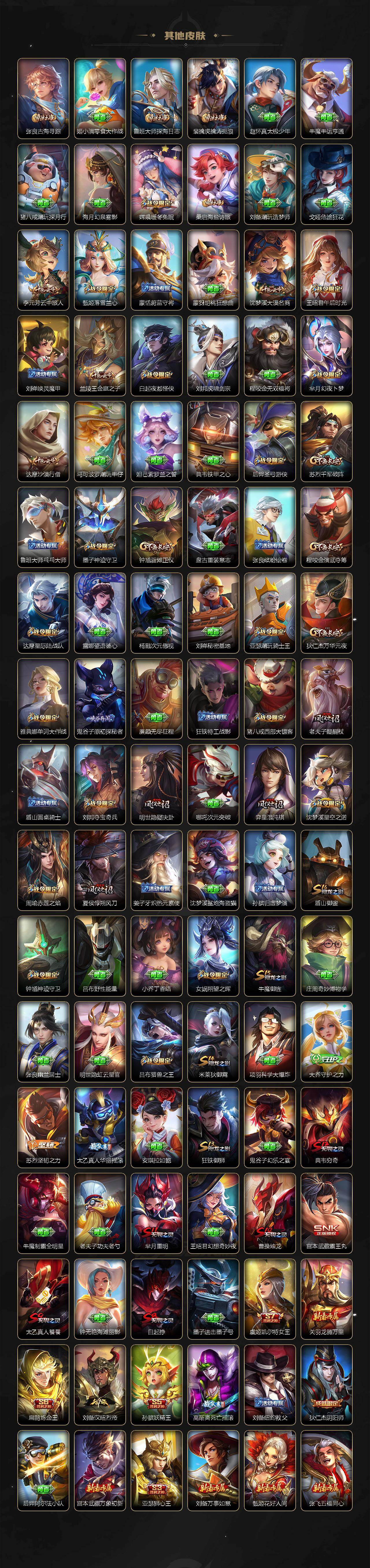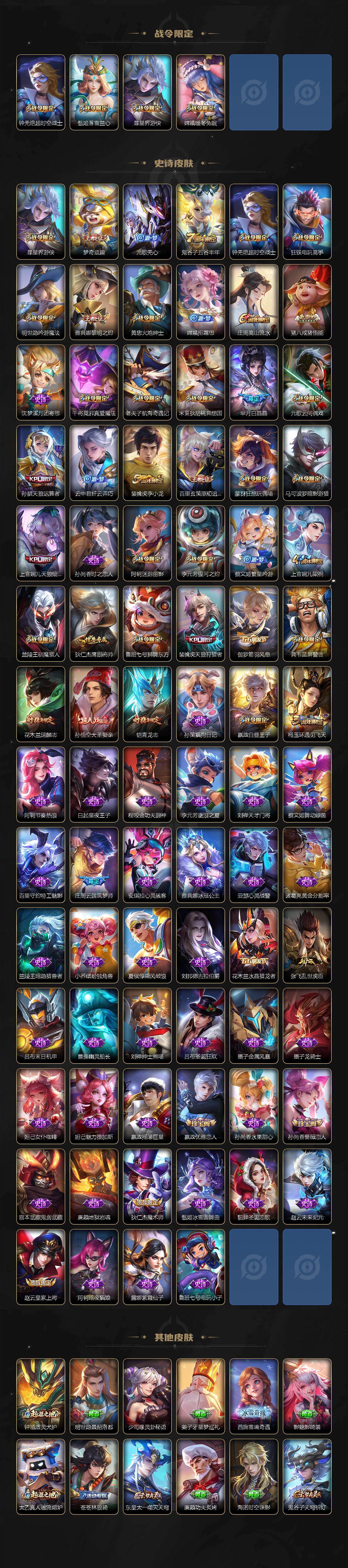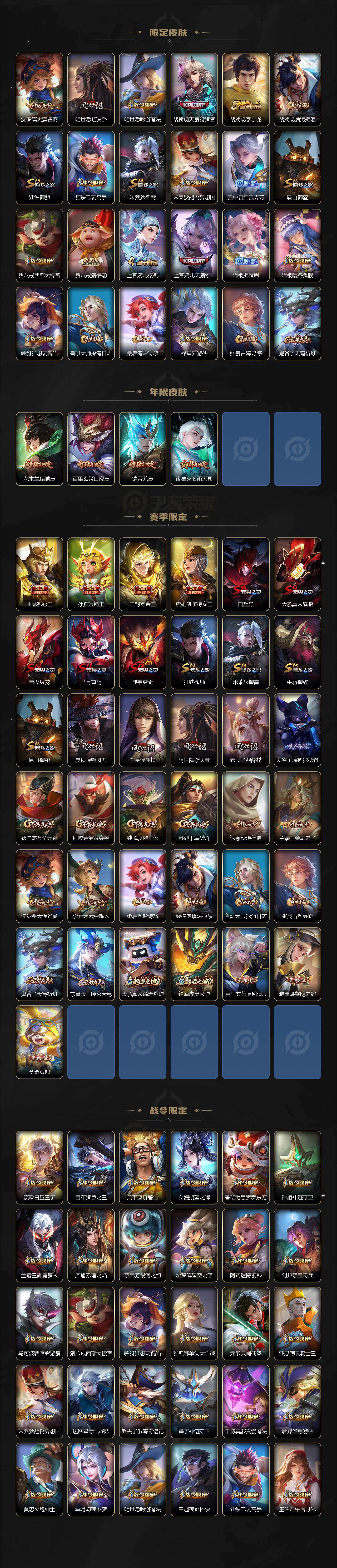 云缨-幻光神枪/不知火舞-绯月行/王昭君-星穹之声/娜可露露-前尘镜/孙尚香-异界灵契/诸葛亮-时雨天司/镜-炽阳神光/孙悟空-零号·赤焰/关羽-武圣/曜-云鹰飞将/貂蝉-猫影幻舞/张良-黄金白羊座/虞姬-云霓雀翎/达摩-黄金狮子座/百里玄策-白虎志/白起-狰/狄仁杰-阴阳师/虞姬-凯尔特女王/赵云-皇家上将/墨子-神迹守卫/嬴政-优雅恋人/嬴政-白昼王子/孙尚香-蔷薇恋人/鲁班七号-狮舞东方/