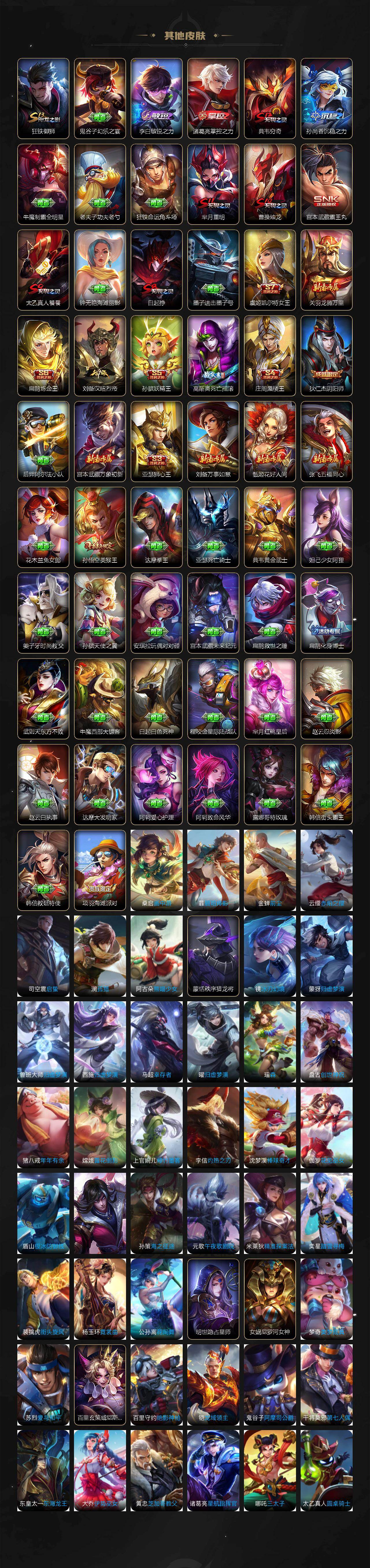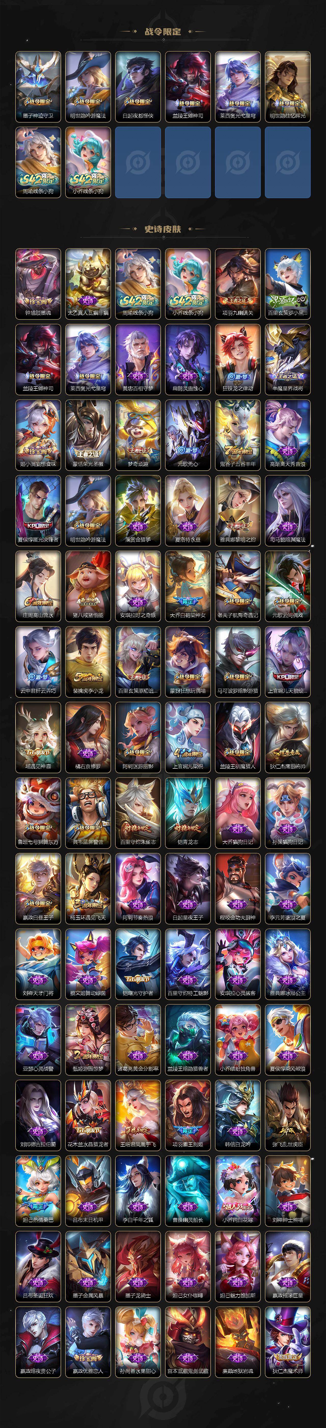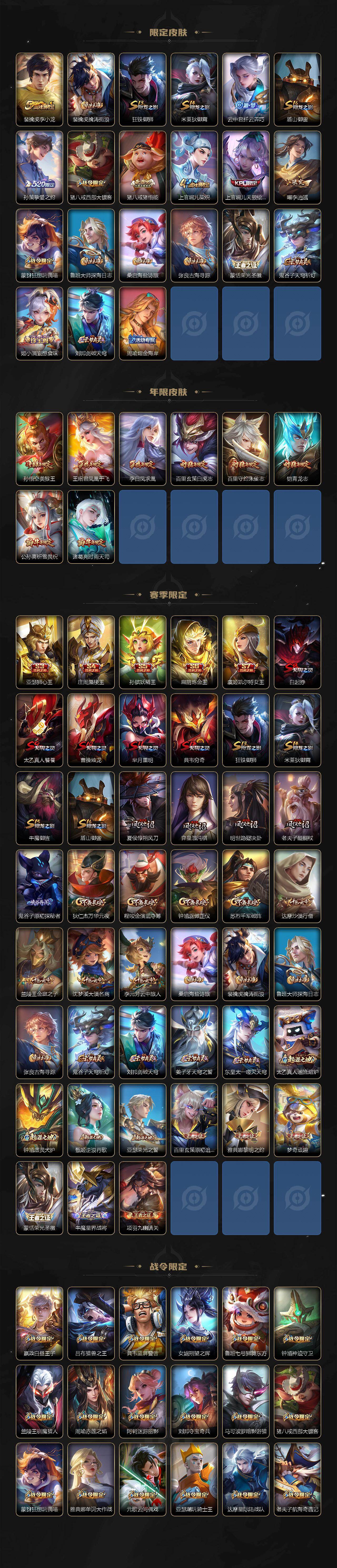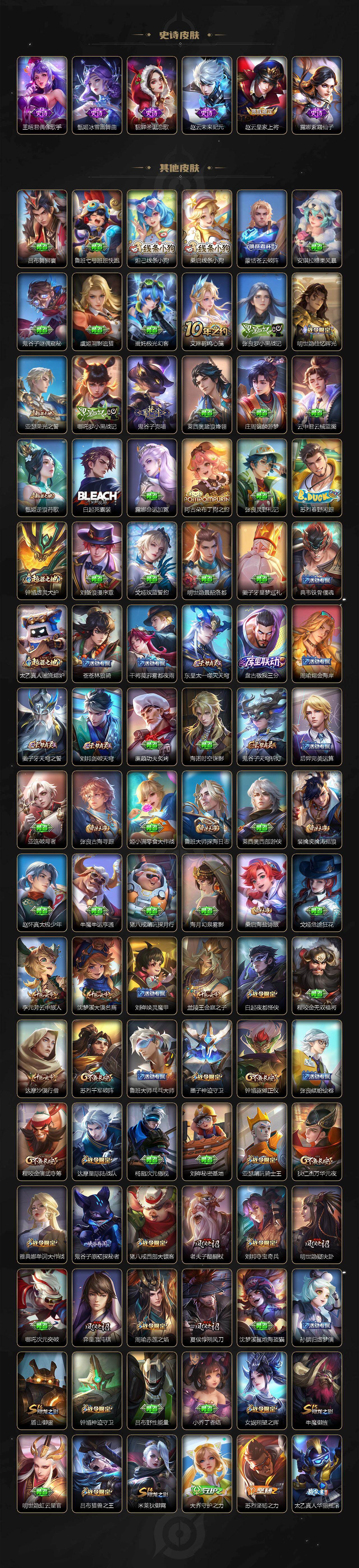 后羿神树通天/桑启-鸣野蒿/马超-无双飞将/孙策-挚爱之约/赵云-淬星耀世/曜-李逍遥/小乔-音你心动/公孙离-祈雪灵祝/诸葛亮-时雨天司/铠-绛天战甲/虞姬-启明星使/李信-一念神魔/貂蝉-猫影幻舞/张良-黄金白羊座/百里玄策-白虎志/李白凤求凰/宫本武藏-地狱之眼/孙悟空-地狱火/白起-狰/姜子牙-天穹之誓/狄仁杰-阴阳师/小乔-纯白花嫁/虞姬-凯尔特女王/赵云-皇家上将/墨子-神迹守卫/