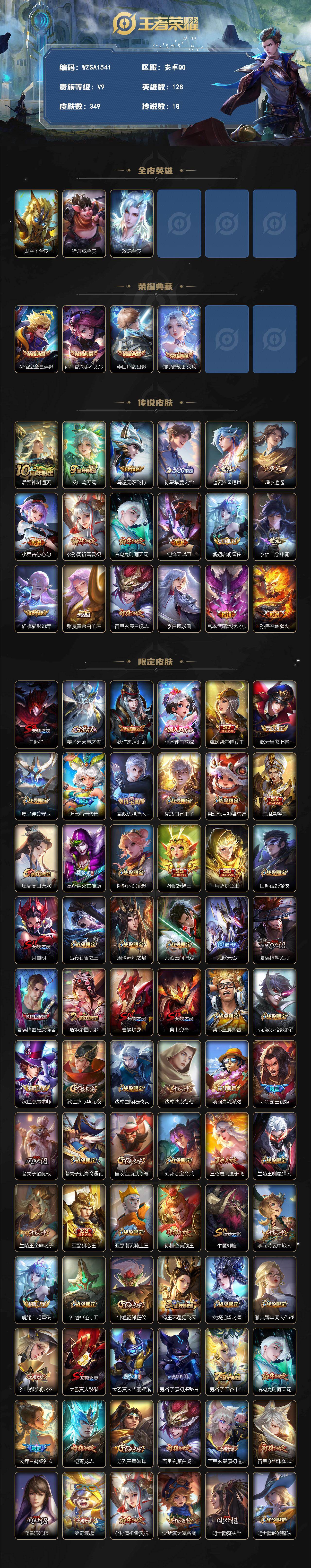 贵族8准贵9/皮肤349/典藏4/传说18/史诗95/英雄128/鬼谷子全皮/猪八戒全皮/敖隐全皮/孙悟空-全息碎影/孙尚香-杀手不太冷/李白-鸣剑·曳影/伽罗-最初的交响/后羿神树通天/