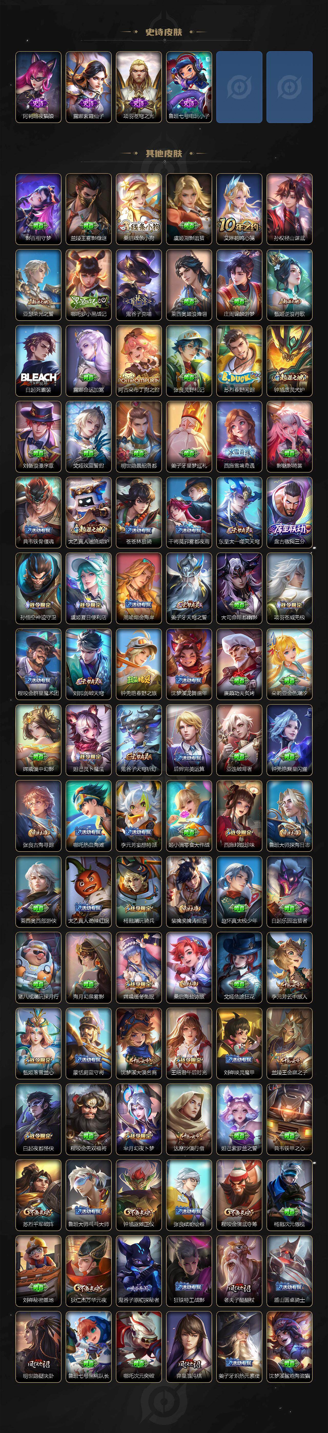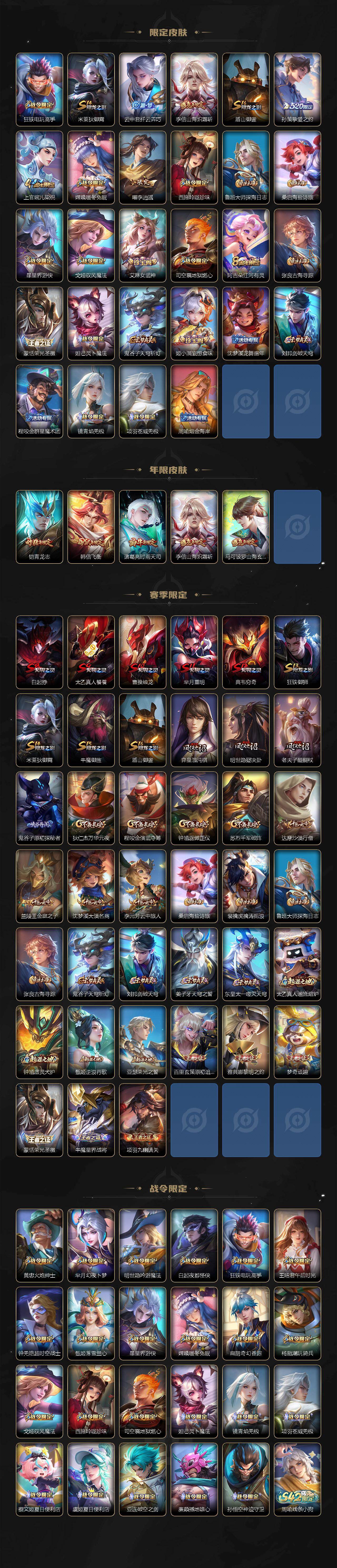 后羿神树通天/云缨-幻光神枪/桑启-鸣野蒿/澜-逐花归海/项羽-无限倾心/李信-山海·炽霜斩/吕布-怒海麟威/李白-诗剑行/橘右京-枫霜尽/孙策-挚爱之约/赵云-淬星耀世/王昭君-乞巧织情/曜-李逍遥/周瑜-音你心动/诸葛亮-时雨天司/镜-炽阳神光/虞姬-启明星使/曜-云鹰飞将/李信-一念神魔/张良-黄金白羊座/干将莫邪-久胜战神/虞姬-云霓雀翎/达摩-黄金狮子座/花木兰-冠军飞将/后羿-黄金射手