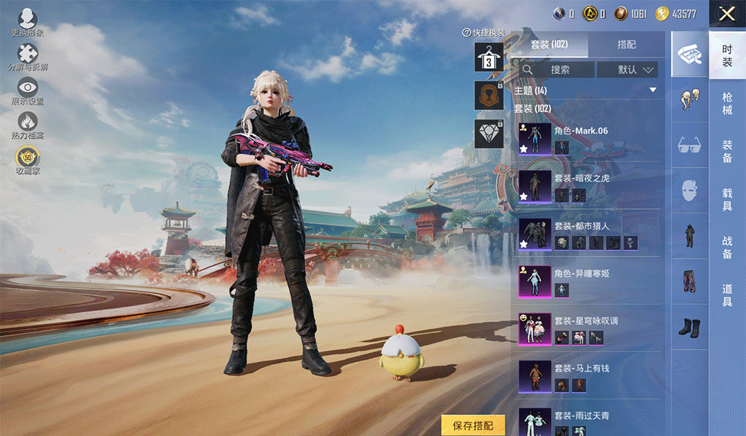 特效枪9:AUG-星之彼岸/7级,,燃烧瓶-天降桃花/3级,,AKS-74U-森灵之息/5级,,Kar98K-巳巳如意/5级,,ACE32-萌骑漫游/3级,,AA12-G-萌骑幻想/2级,,DP-28-豹影疾电/5级,,Mk14-福马献瑞/5级,,UMP45-萌骑冒险/2级,