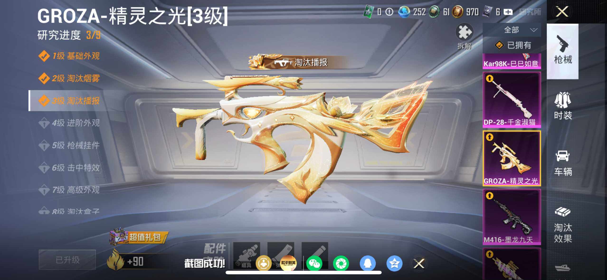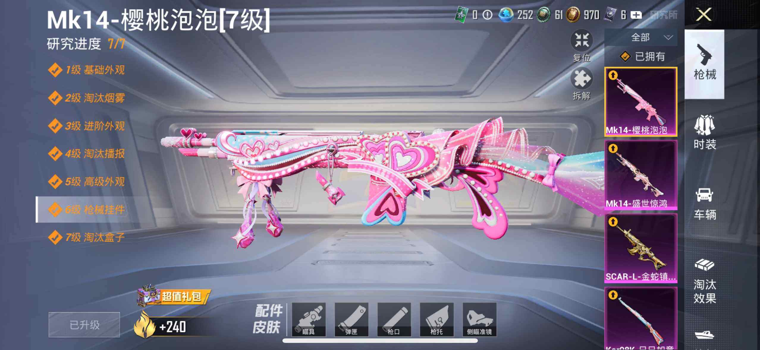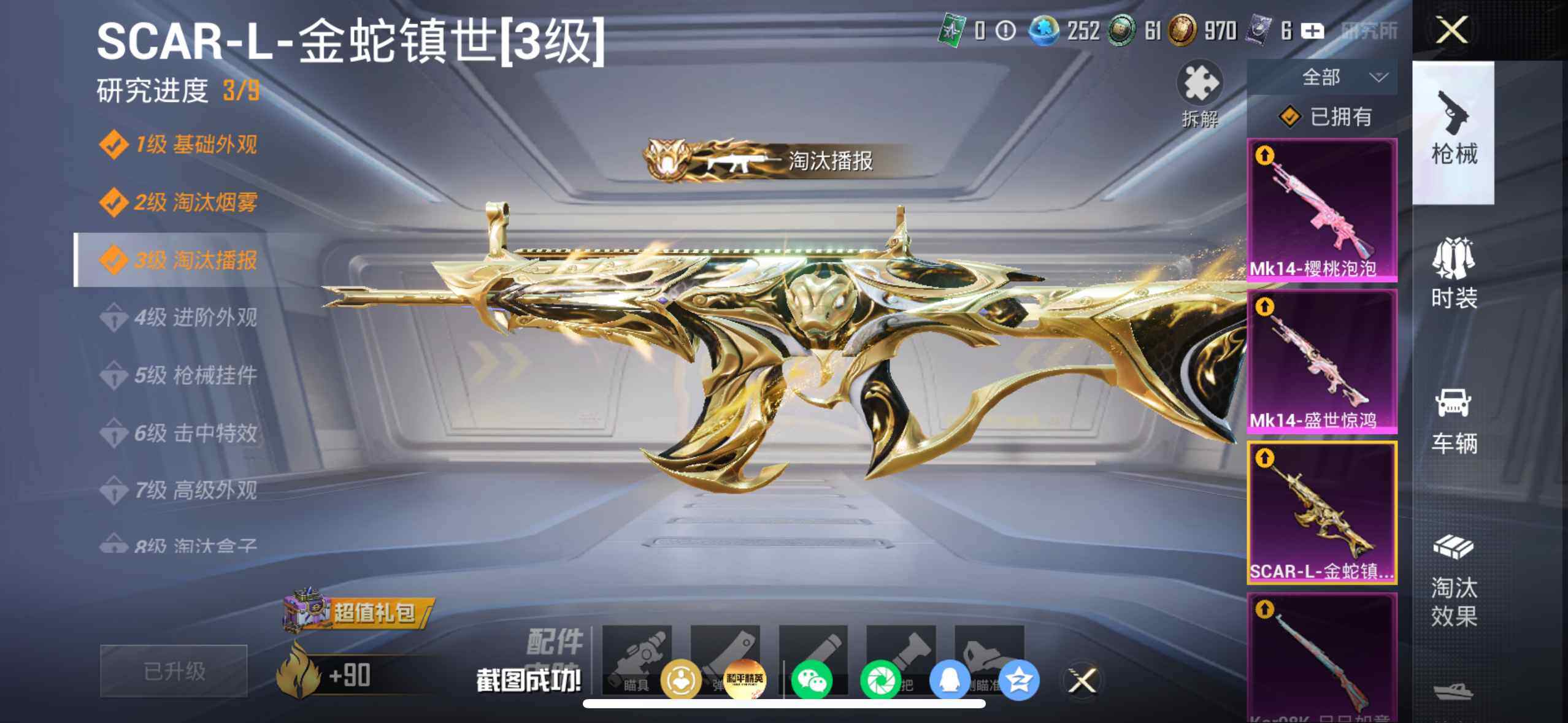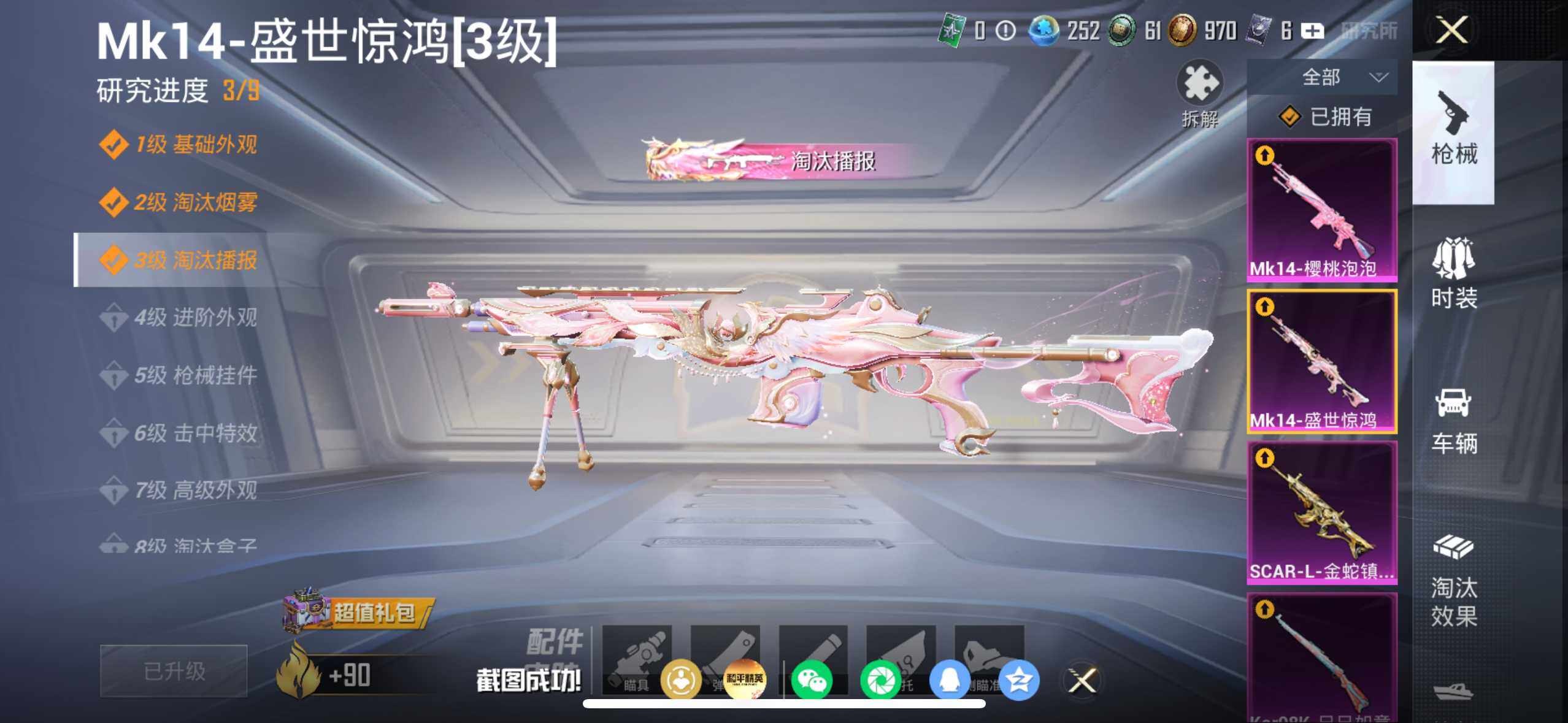 【粉色枪皮等级】:SCAR-L-金蛇镇世(三级),M416-墨龙九天(三级),GROZA-精灵之光(三级),P