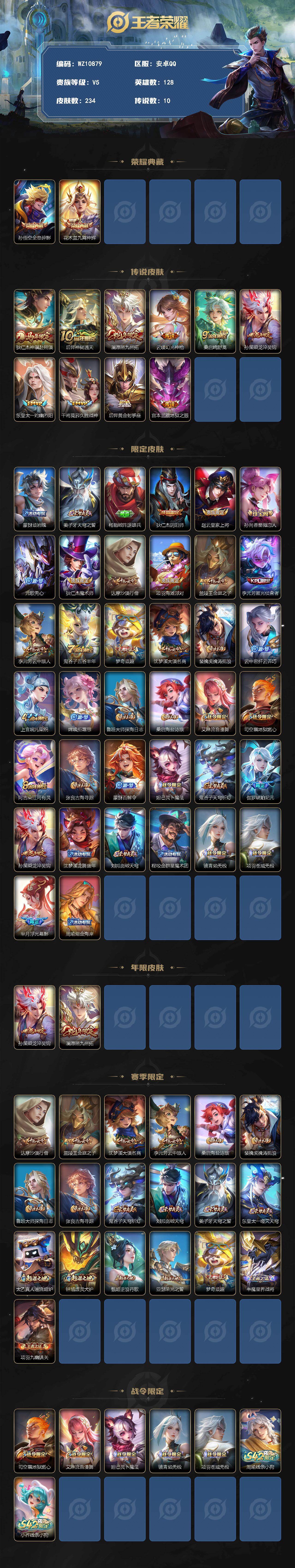 安卓Q-V5-永恒钻石II段位-128英雄-234皮肤-2典藏皮肤-10传说-