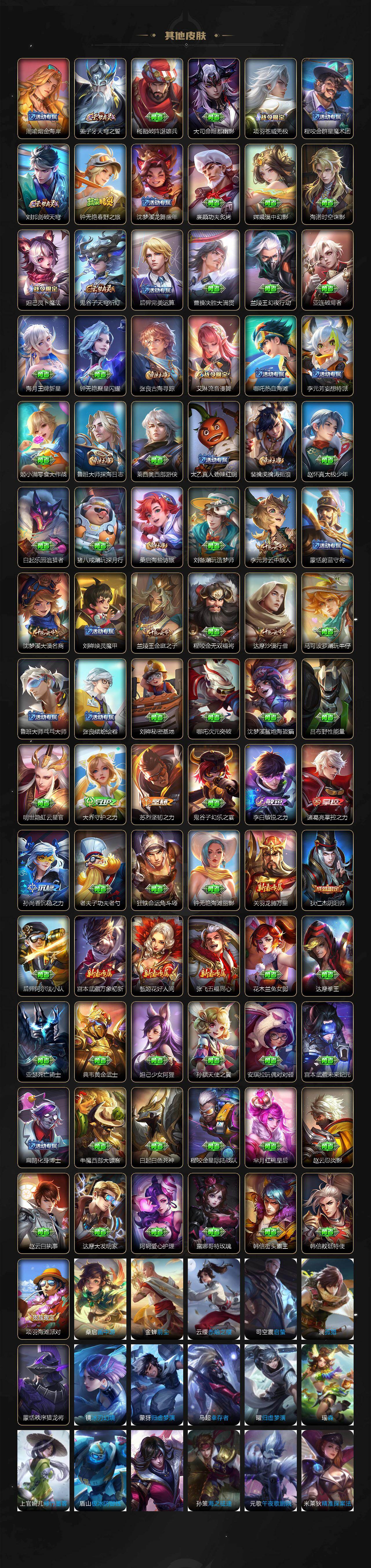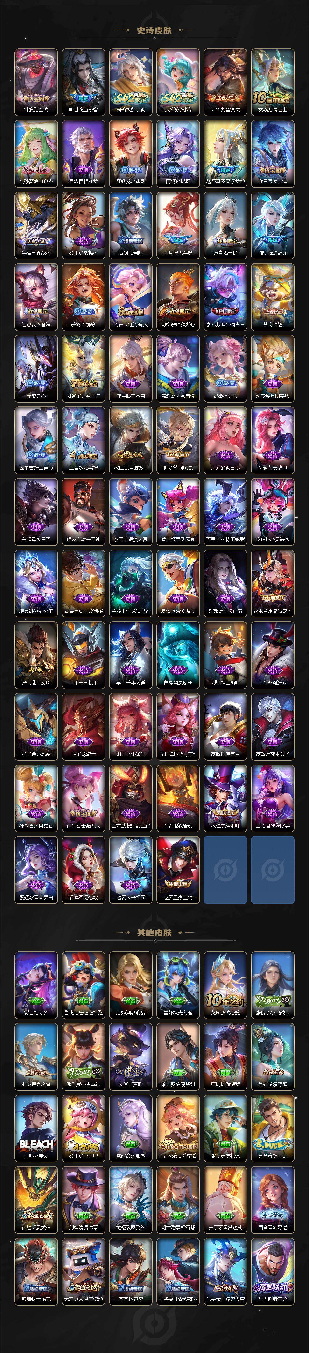 【传说皮肤】:狄仁杰神骥赴朔漠,后羿神树通天,澜愿照九州拓,云缨幻光神枪,桑启鸣野蒿,孙策乘龙淬吴钩,东皇太一灼幽烈阳,干将莫邪久胜战神,后羿黄金射手座,宫本武藏地狱之眼