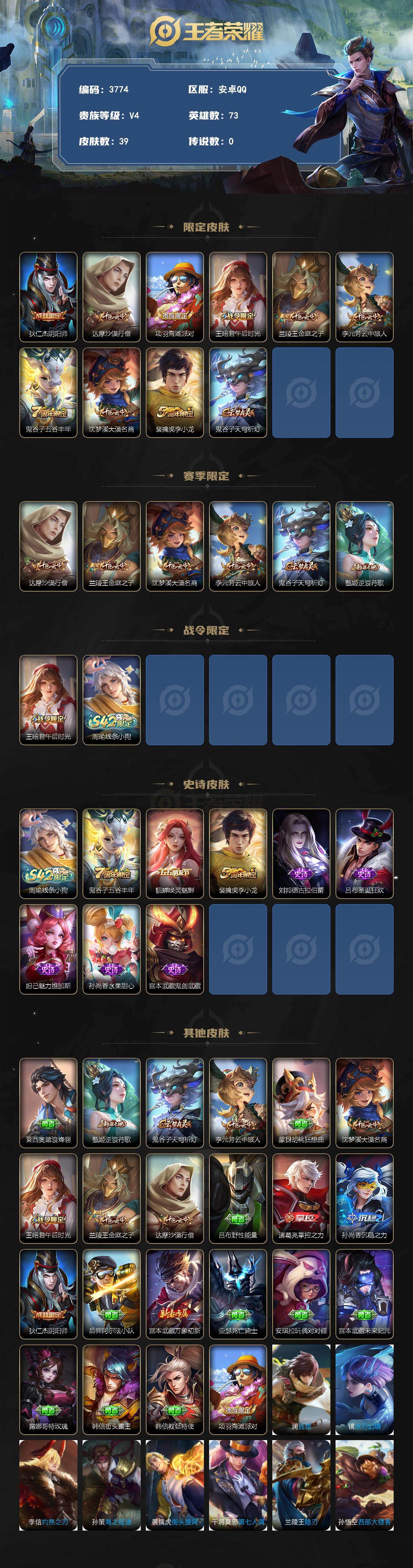 特价小号】安卓Q-V4-永恒钻石V段位-73英雄-39皮肤-8史诗