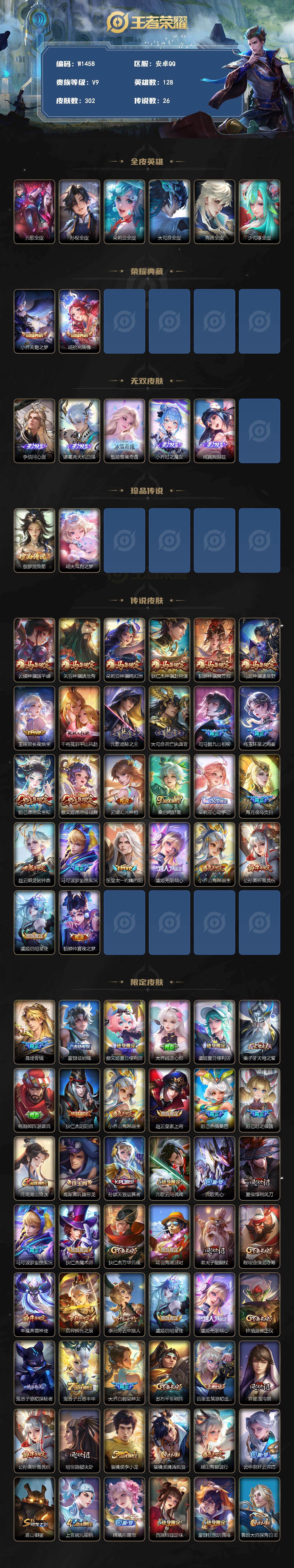 可改实名/女号/V9/拾光映像/天鹅之梦/瑶真我赫兹/雪境奇遇/时之魔女/瑶大耳狗之梦/-302皮肤2典藏5无双2珍品传说26传说