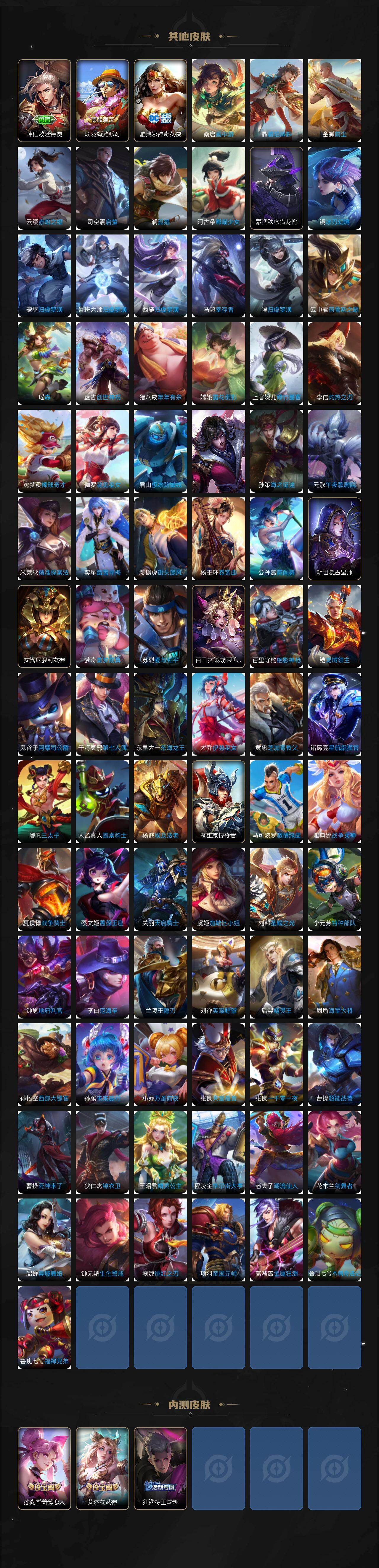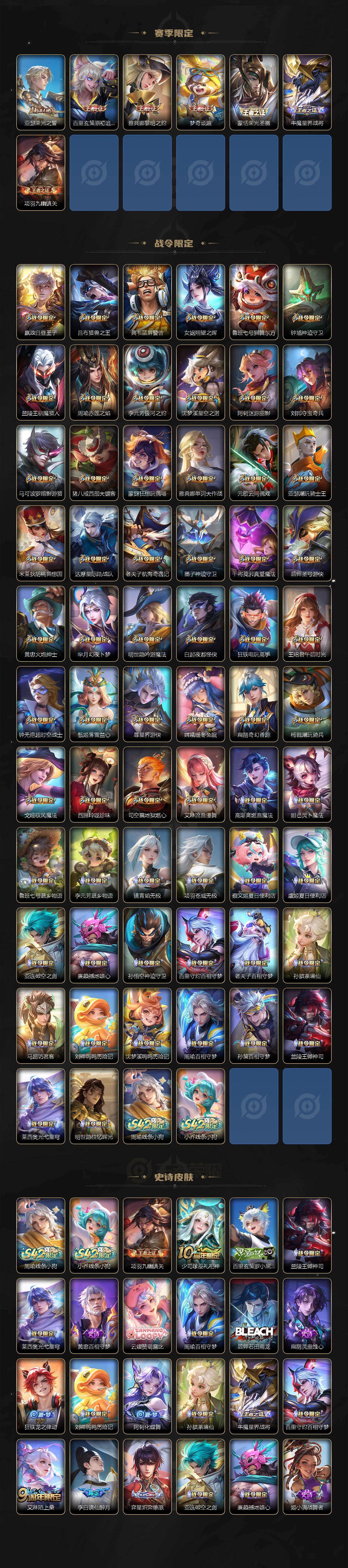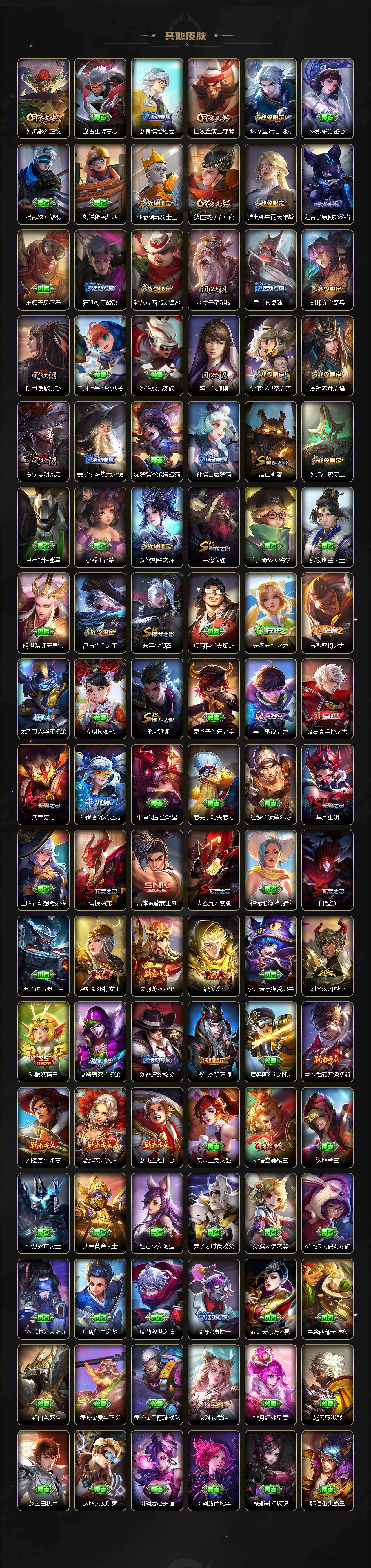 【英雄全皮】:廉颇全皮,墨子全皮,刘禅全皮,扁鹊全皮,夏侯惇全皮,姜子牙全皮,刘邦全皮,孙权全皮,橘右京全皮,哪吒全皮,黄忠全皮,百里玄策全皮,沈梦溪全皮,狂铁全皮,盾山全皮,猪八戒全皮,敖隐全皮,蒙犽全皮,鲁班大师全皮,蒙恬全皮,阿古朵全皮,夏洛特全